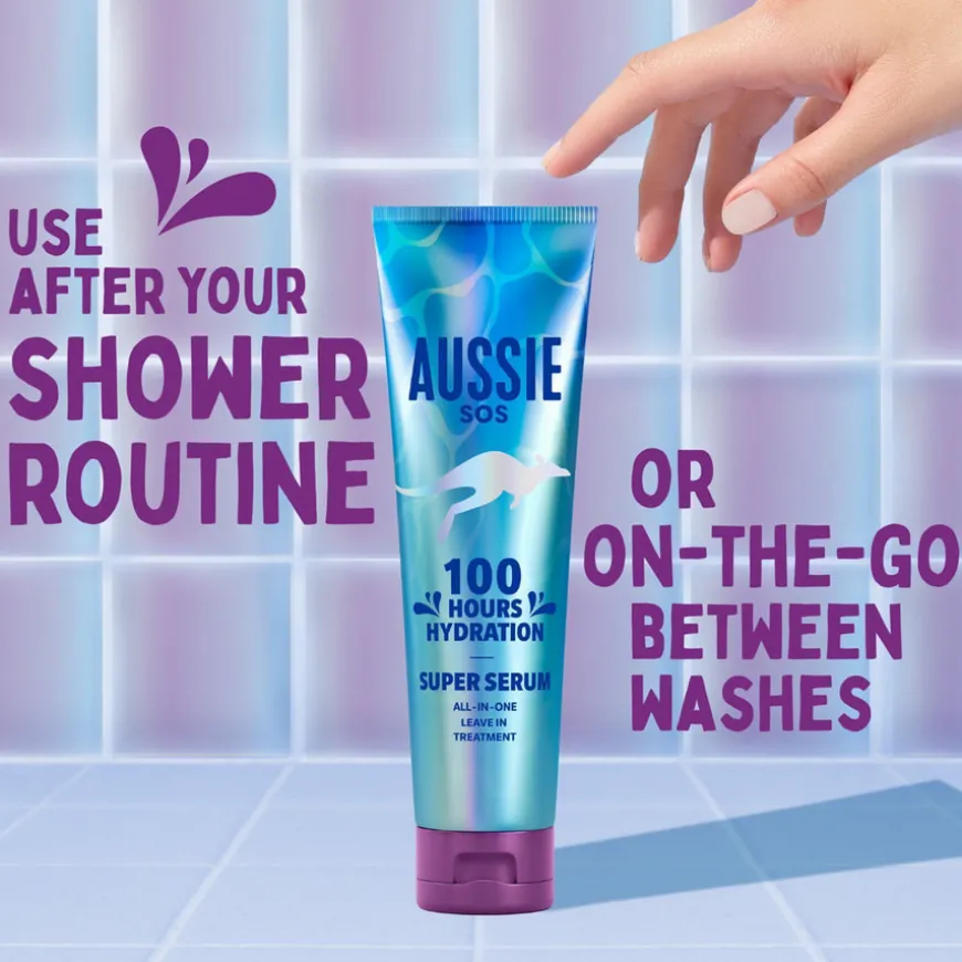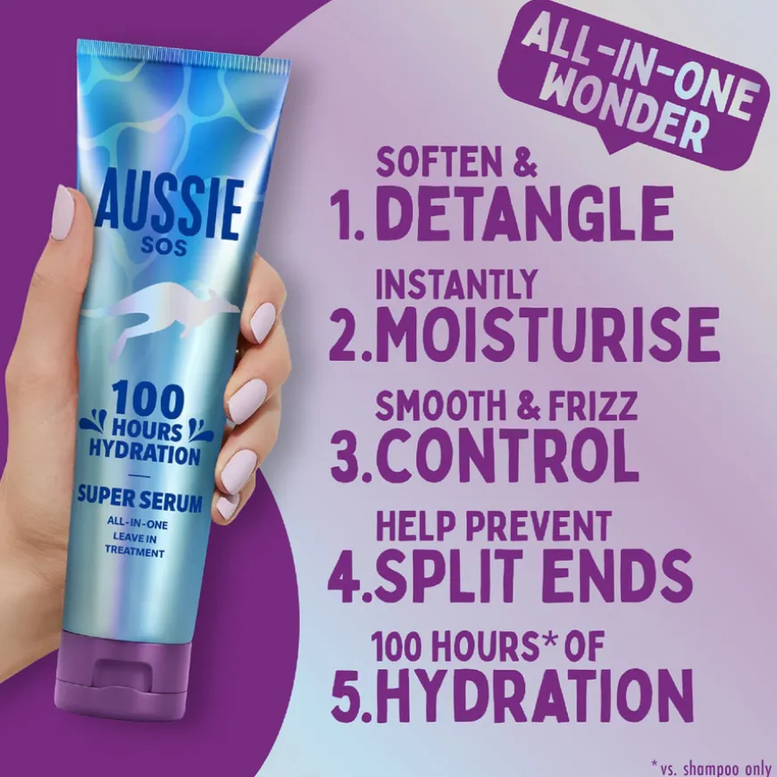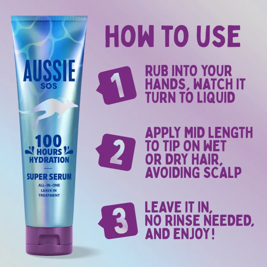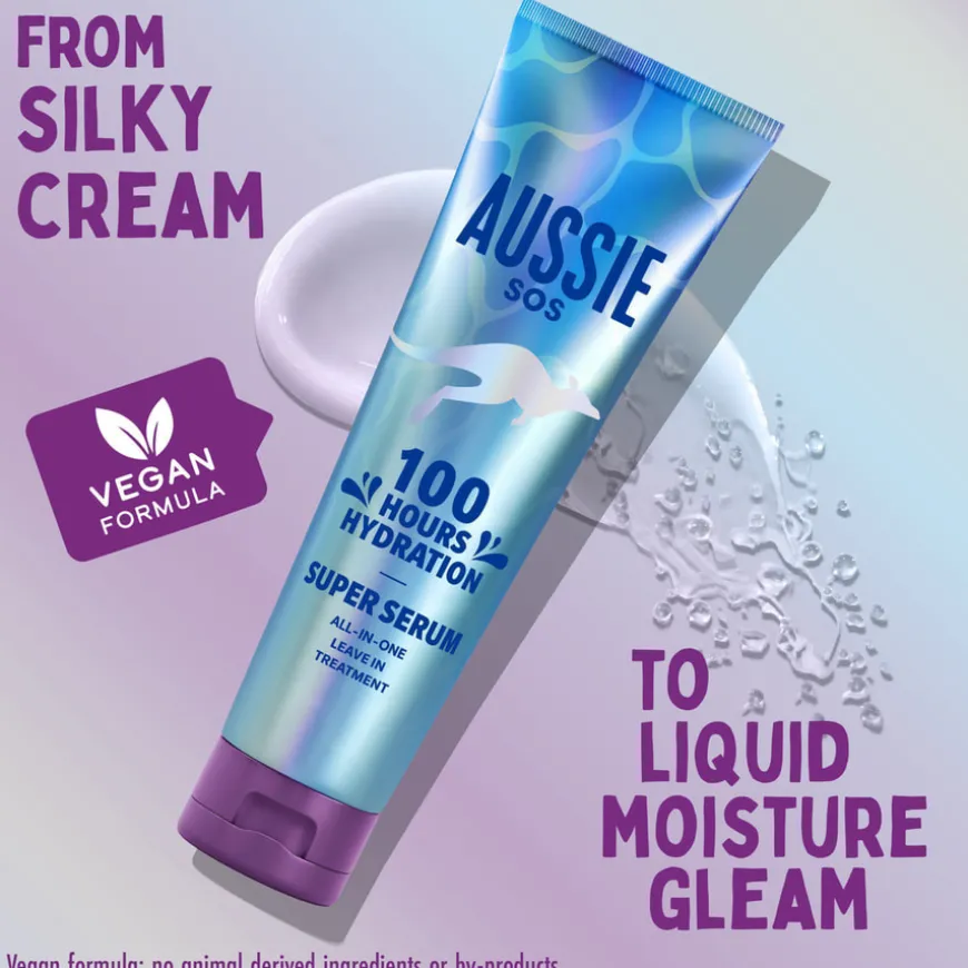 SOS Super Serum All In One Leave-in Treatment fra Aussie er en alt-i-ett-løsning for tørt og skadet hår som trenger øyeblikkelig pleie. Dette lette, men kraftige serumet gir intensiv fuktighet, glatter, mykgjør og fjerner floker. Det hjelper også med å kontrollere krusete hår og forebygge splittede tupper, samtidig som det beskytter håret mot daglig slitasje. Den veganske formelen er beriket med australske superingredienser, og serumet gir fuktighet som varer i opptil 100 timer. Perfekt for bruk etter dusjen eller som en oppfriskning når du er på farten, uten behov for skylling. Håret etterlates mykt, glatt og vitalisert – klart for dagen din!