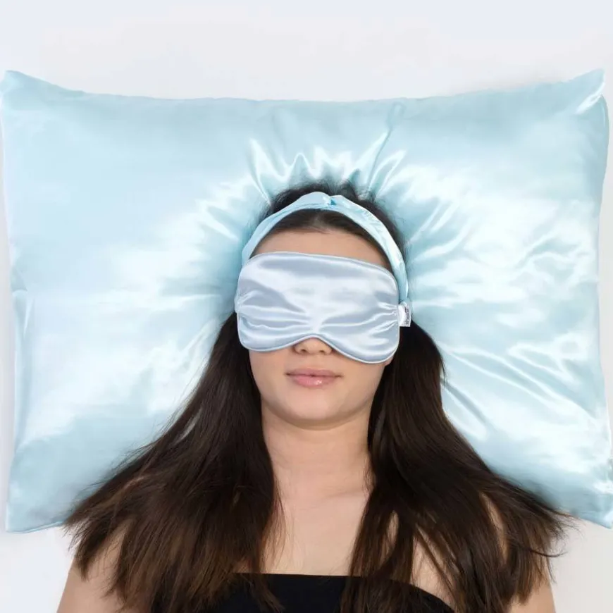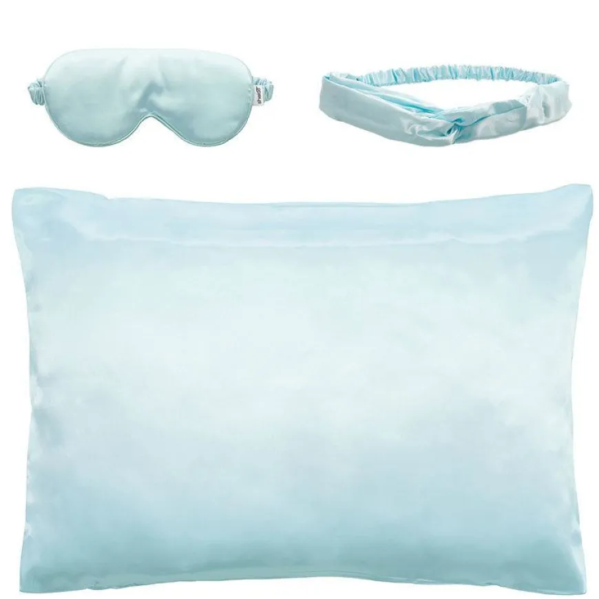 Satin Sleeping Set er et sovesett bestående av tre produkter, et putetrekk, et hårbånd og en sovemaske. Putetrekket og hårbåndet er av sateng, mens den behagelige sovemasken kommer i imitert silke. Alle tre produktene kommer i en herlig lyseblå farge. Sammen sikrer de skjønnhetssøvnen din uten at håret blir skadet fra friksjoner på dette deilige putetrekket. Sovemasken hjelper deg med å kunne oppnå en avslappende søvn uten lysforstyrrelser. Hårbåndet samler håret og kan brukes om natten mens du sover uten at det sliter på håret, og/eller for å holde håret borte fra ansiktet slik at du ikke får ansiktsprodukter over på håret. Slapp av og få en fredelig natts søvn med ditt nye, herlige sovesett, du også.