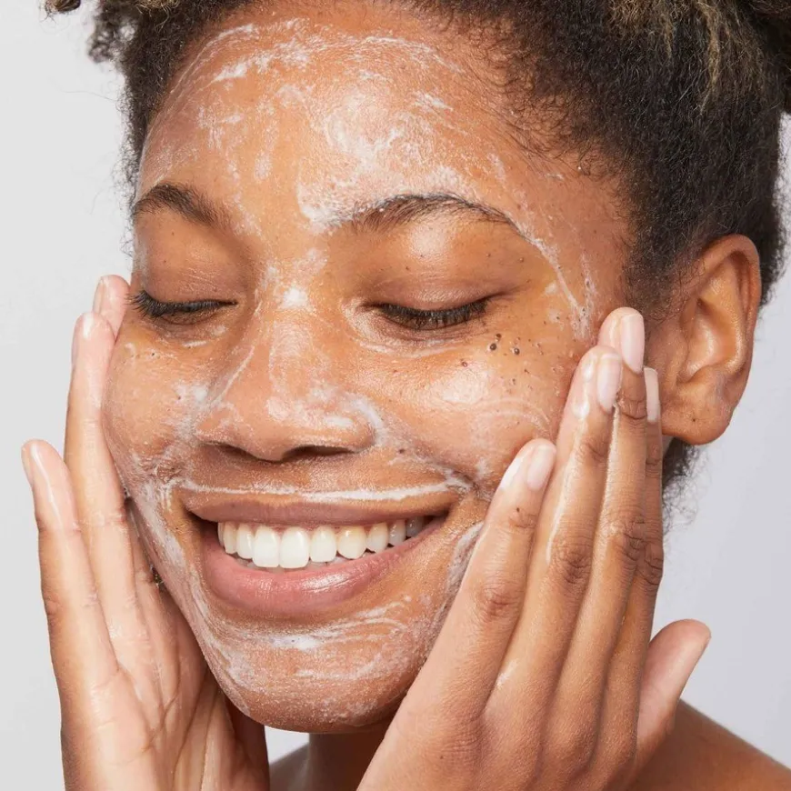 - Skum opp en liten mengde rensegelé mellom fuktede hender og påfør på fuktet hud.