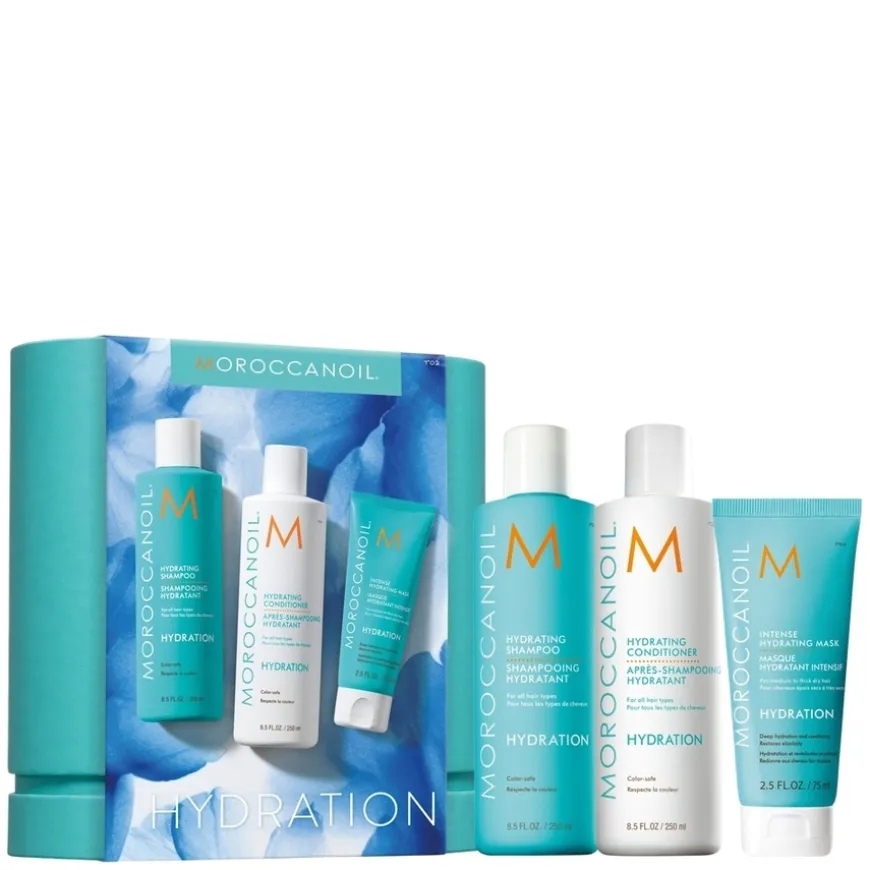 Spring Kit Hydration fra Moroccanoil er et komplett fuktighetsgivende hårpleiesett som passer perfekt for tørt, dehydrert og fargebehandlet hår. Alle produktene er beriket med arganolje, vitamin A og E og fuktighetsgivende røde alger, og er trygge for fargebehandlet hår. Settet passer for normalt til tykt hår og gir både umiddelbar og langvarig hydrering.