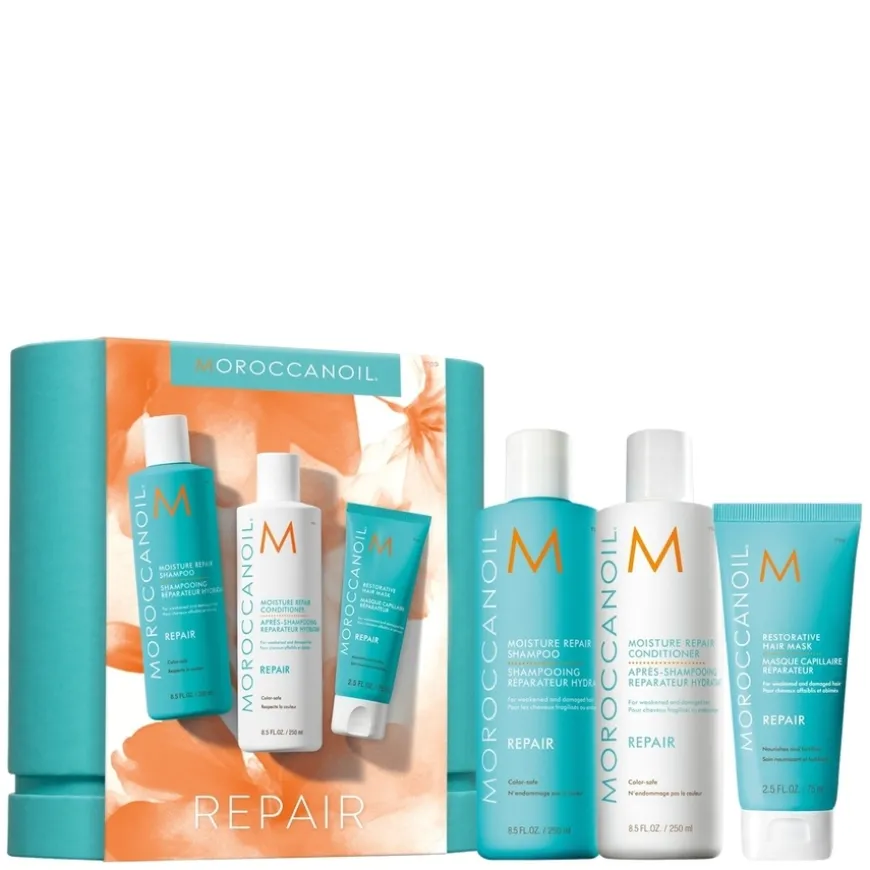 Spring Kit Repair fra Moroccanoil er et gjenoppbyggende hårpleiesett som passer perfekt for deg med tørt, skadet eller kjemisk behandlet hår. Produktene er beriket med pleiende ingredienser som arganolje, keratin og proteiner, som sammen gir næring og styrker håret fra innsiden og ut. Håret blir mykere, mer glansfullt og lettere å håndtere – uten å tynge. Settet er fargesikkert og passer for alle hårtyper, spesielt farget og skadet hår.