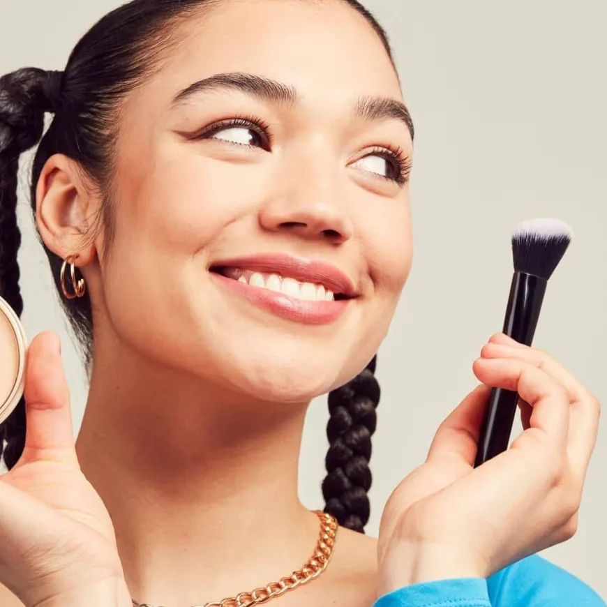 - Påfør et lett lag med kost for å sette foundation og gi en matt look, og bruk gjerne en poof i løpet av dagen for å redusere glans.