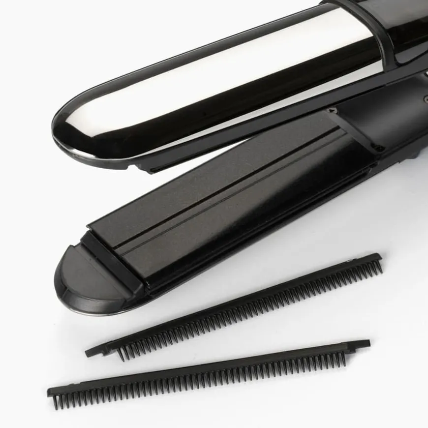 De 39mm brede diamantkeramiske platene sikrer en jevn varmefordeling og effektivt resultat i ett enkelt drag. En avtakbar kam hjelper til med å separere håret for bedre stylingkontroll. Rettetangen har også ionisk teknologi som reduserer statisk elektrisitet og øker glans.