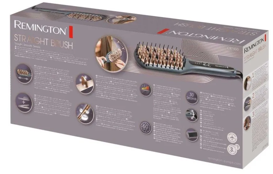Remington Straight Brush er en rettebørste som børster og retter ut håret samtidig. Denne rettebørsten både løsner og flater ut håret ditt på samme tid, og etterlater det frizzfritt og skinnende. Tre temperaturnivåer og en lang ledning gjør den komfortabel og enkel å bruke.
