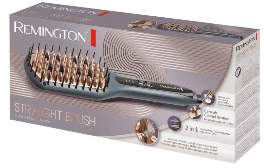 Å fikse håret om morgenen har aldri vært enklere.Med Straight Brush har Remington kombinert to av de vanligste hårstylingverktøyene som mange kvinner bruker hver morgen; hårbørsten og rettetangen. Denne flate børsten er elektrisk og avgir varme opp til 230° og har et keramisk belegg på » bust»» som overfører varmen til håret mens du børster og retter det ut mens du løser ut floker og sparer verdifulle minutter i morgenrutinen.