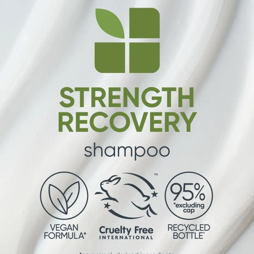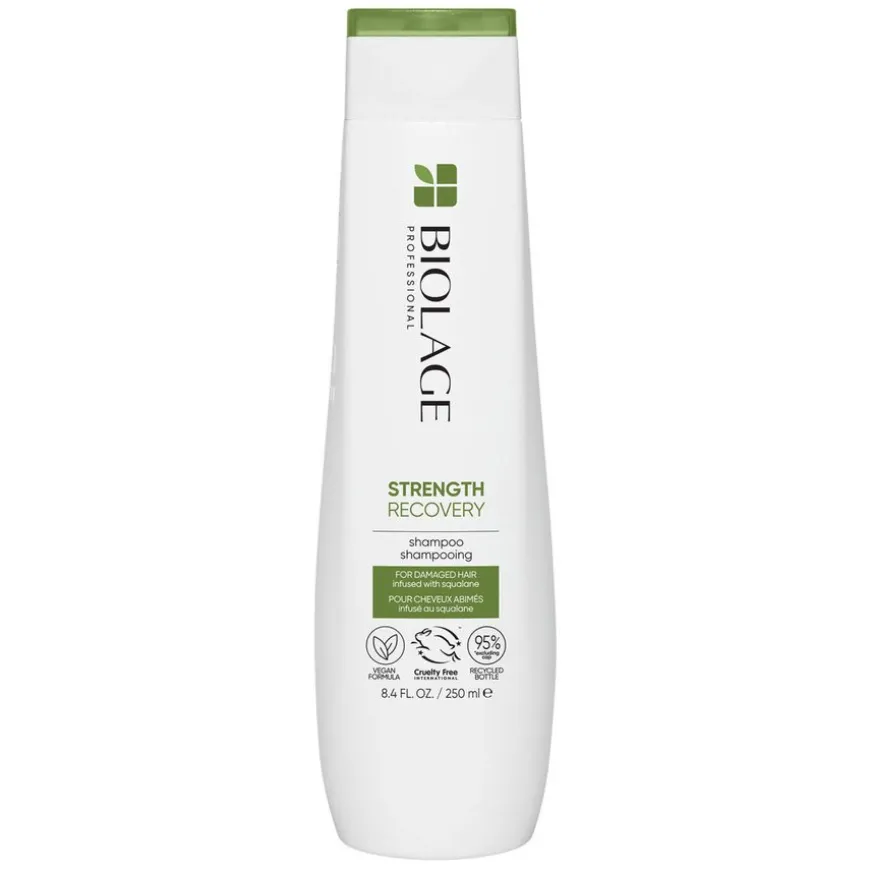 Strength Recovery Shampoo er en shampoo som reparerer skadet hår. Beriket med squalane for å etterfylle, beskytte og gjenopprette hårfibrene. Shampooen har en kremet konsistens som rengjør uten å tynge håret. Det fyldige skummet bidrar til å fjerne urenheter og produktoppbygging, samtidig som fibrene bevares. Egnet for alle hårtyper, inkludert grått og fargebehandlet hår.