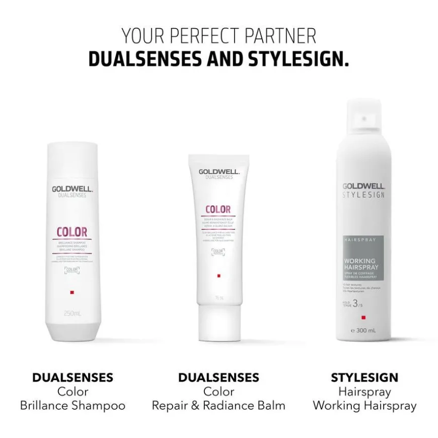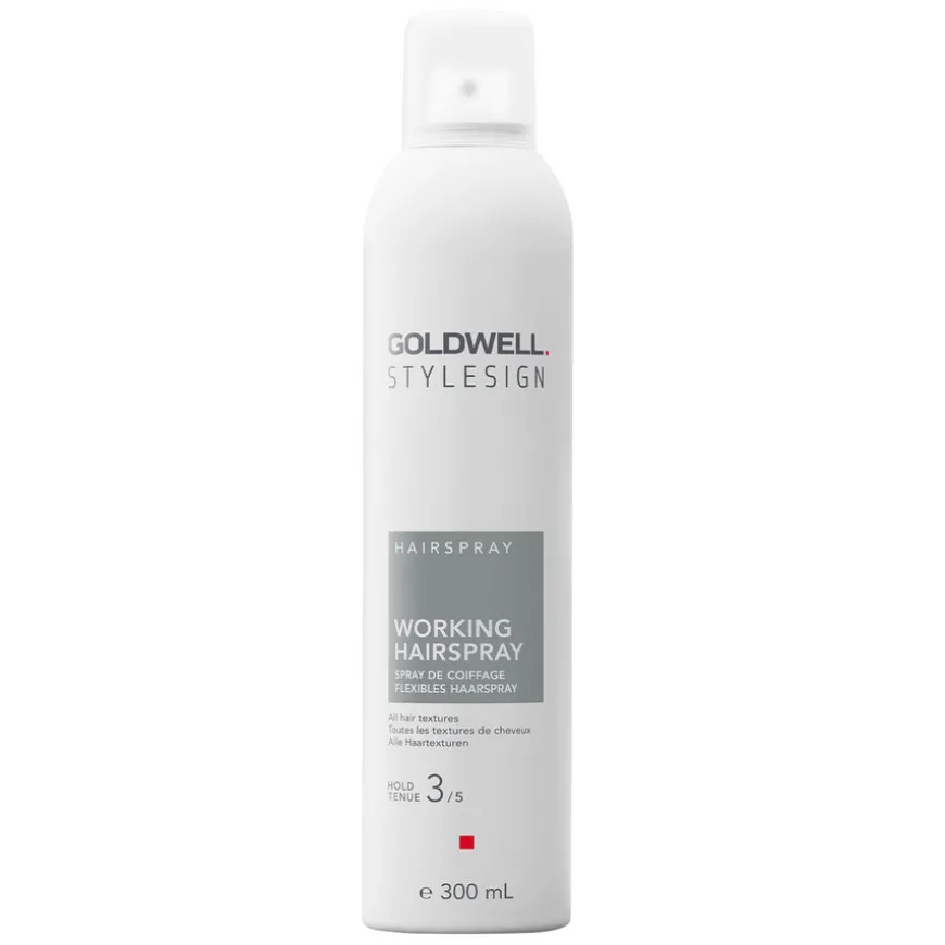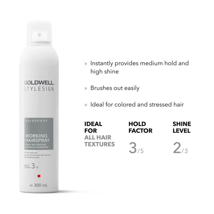 StyleSign Working Hairspray gir umiddelbart medium hold, høy glans, med beskyttelse mot luftfuktighet og frizz i opptil 72 timer. Produktet har en vegansk formel, er CO2 kompensert og dermatologisk testet. Holdfaktor 3/5 og glansnivå 2/3. For alle hårteksturer, perfekt for farget og stresset hår.