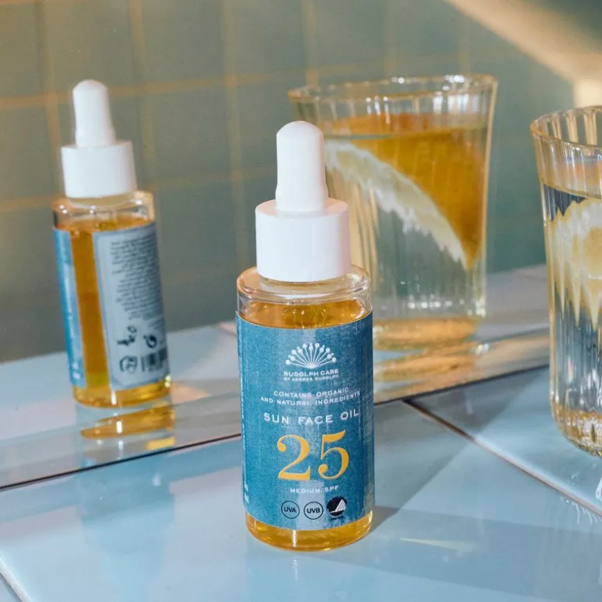 Sun Face Oil SPF 25 eren fuktighetsgivende og pleiende ansiktsolje som beskytter huden i ansiktet mot solens stråler med solfaktor 25. Sun Face Oil har en oppstrammende effekt og forbedrer hudens tekstur og tone. Konsistensen føles lett og delikat på huden, og oljen trenger raskt inn. Det høye innholdet av aktive ingredienser arbeider med huden – som algeekstrakt, rik på omega 3-6-9-fettsyrer, som opprettholder hudens smidighet og mykhet. Tindvedolje booster huden med C-vitamin – mens nypeolje gjennomfukter huden og gir den elastisitet og glød. Sertifisert med Svanemerket og Vegan Trademark.