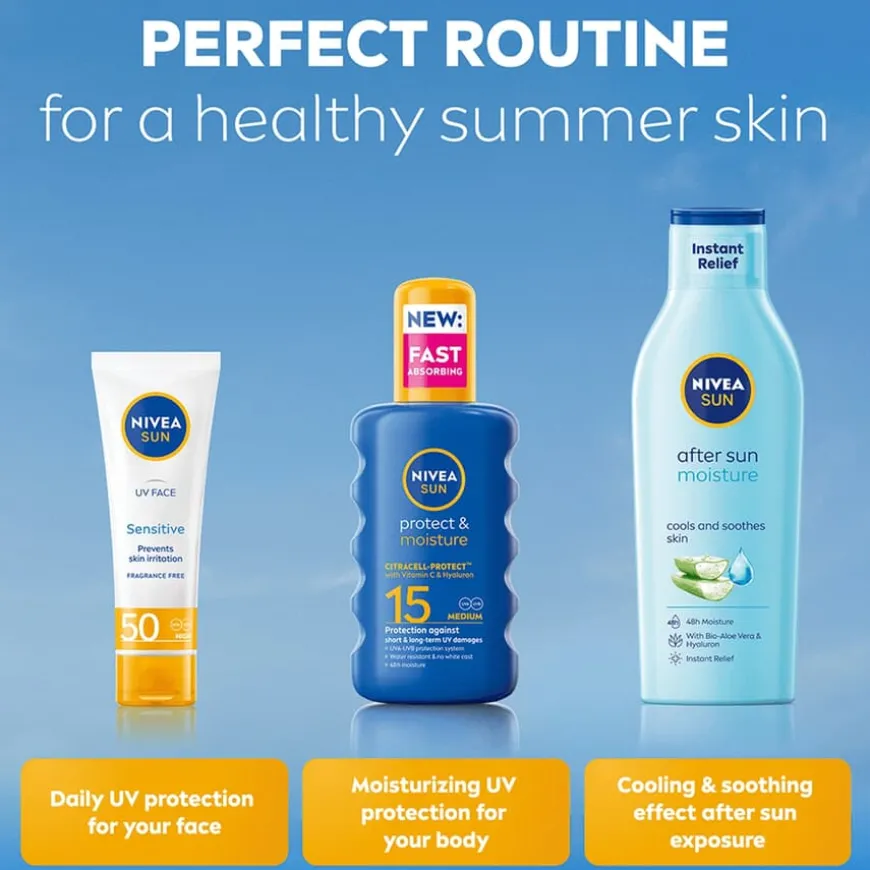 NIVEA SUN Protect & Moisture er en effektiv solkremserie som beskytter huden og tar vare på klærne. Den fuktighetsgivende formulaen har en optimal balanse mellom UVA- og UVB-filter som beskytter huden. Den beskytter huden umiddelbart mot solbrenthet og for tidlig aldring, og hjelper også til å redusere risikoen for soleksem. Vannfast og dermatologisk testet. Inneholder Anti Stains After Wash Complex som hjelper til å redusere intensiteten av flekker fra solkrem etter vask. Her i en praktisk sprayflaske for lett påføring.