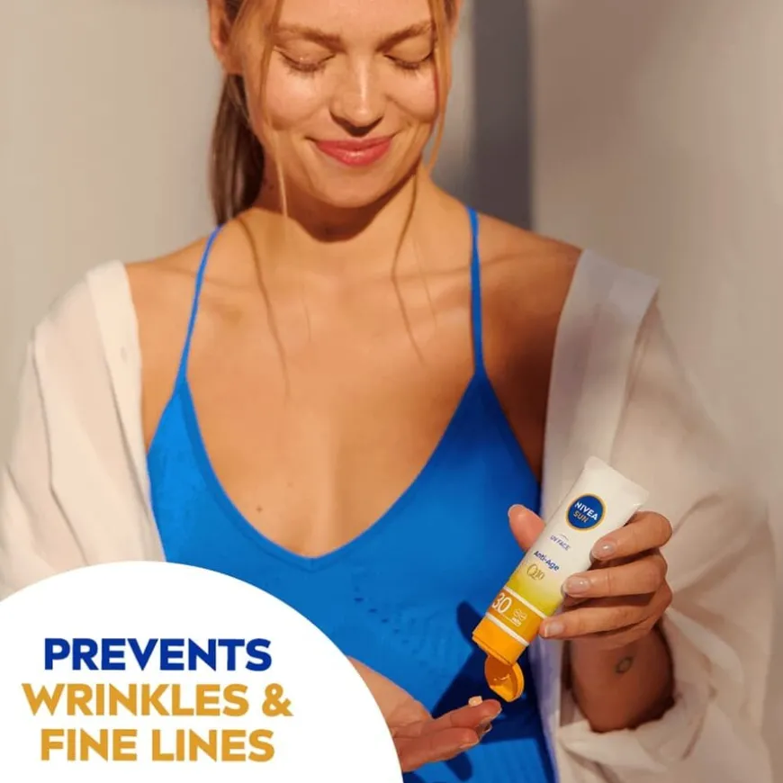 Sun UV Face Anti Age Q10 Cream SPF 50 er en høybeskyttende ansiktssolkrem med en lett og ikke-klebrig formel, spesielt utviklet for sensitiv hud. Den inneholder effektive UVA/UVB-filtre som gir umiddelbar beskyttelse mot solens stråler og høyenergilys. Beriket med Q10 og naturlige antioksidanter, hjelper den med å forebygge rynker, redusere pigmentflekker og motvirke for tidlig aldring forårsaket av solen. Solkremen gir også intens fuktighet, etterlater huden myk og smidig, og er egnet for daglig bruk. Formelen er dermatologisk testet og har en Ocean Respect-formel, fri for skadelige UV-filtre, noe som gjør den mer skånsom for både huden og miljøet. For optimal beskyttelse, påfør rikelig før soleksponering, og gjenta påføringen ofte, spesielt etter bading, svetting eller håndkletørking. Overeksponering for solen kan være helseskadelig, og babyer og små barn bør beskyttes mot direkte sollys.
