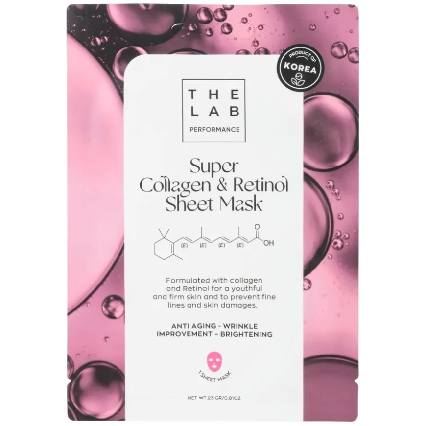 Super Collagen & Retinol Sheet Mask kombinerer to kraftfulle og dokumenterte ingredienser – kollagen og retinol – for å gi huden et merkbart fastere, glattere og mer ungdommelig utseende. Retinol, en form for vitamin A, er en av de mest anerkjente anti-age-ingrediensene innen hudpleie. Den stimulerer hudens egen produksjon av kollagen og elastin, forbedrer hudens struktur, og reduserer synligheten av fine linjer, rynker og pigmentflekker. Kollagen tilfører fukt og styrke til huden, mens retinol bidrar til å jevne ut hudtonen og kontrollere talgproduksjonen. Ved opptak i huden omdannes retinol til A-vitaminsyre, en aktiv form som virker direkte på hudcellene og gir dokumenterte resultater. Passer for moden hud eller hud med ujevn tekstur og pigmentering.
