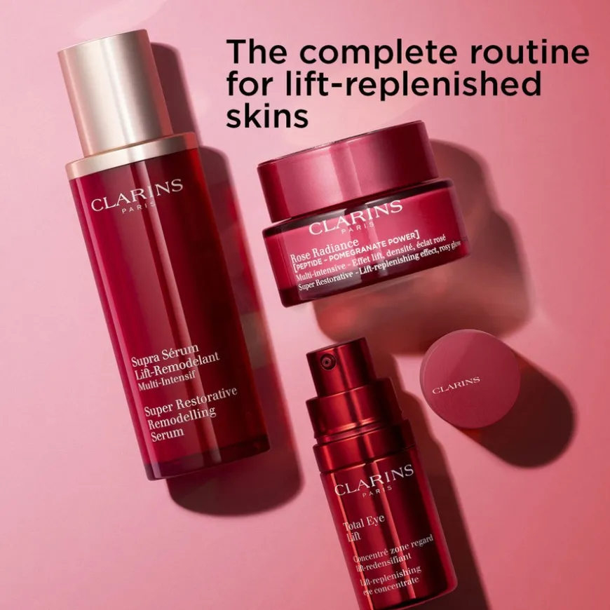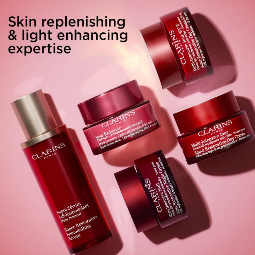 Clarins Super Restorative Rose Radiance er en oppstrammende dagkrem som gjenoppretter gløden i huden. For denne generasjonen av Rose Radiance Cream retter Clarins Research seg mot tap av rosenrød glød i menopausal hud. I hjertet av dens unike formel ligger det nye Peptide – Pomegranate Power, glødekomplekset som hjelper til med å jevne ut hudtonen og gi ny energi til huden. Resultatet: Glattere hud som reflekterer lys bedre og kommer til live med en umiddelbart sunn, rosenrød glød. Clarins har kombinert økologiske gorse- og harungana-ekstrakter for å målrette tegn på slapp hud forårsaket av hormonfall under overgangsalderen. Sammen danner de en kraftig duo med oppstrammende og oppfyllende egenskaper. Huden ser fyldigere, løftet og fastere ut. Den rosenrøde nyansen av Rose Radiance Cream fungerer som en energibooster for både hud og humør, og gir en umiddelbar forskjønnende effekt som gjenoppliver gløden til alle kvinner, uansett hudtype og hudtone. Rose Radiance Cream består av 93 % naturlige ingredienser og har en myk, behagelig tekstur. Den trekker raskt inn og føles ikke fet på huden.