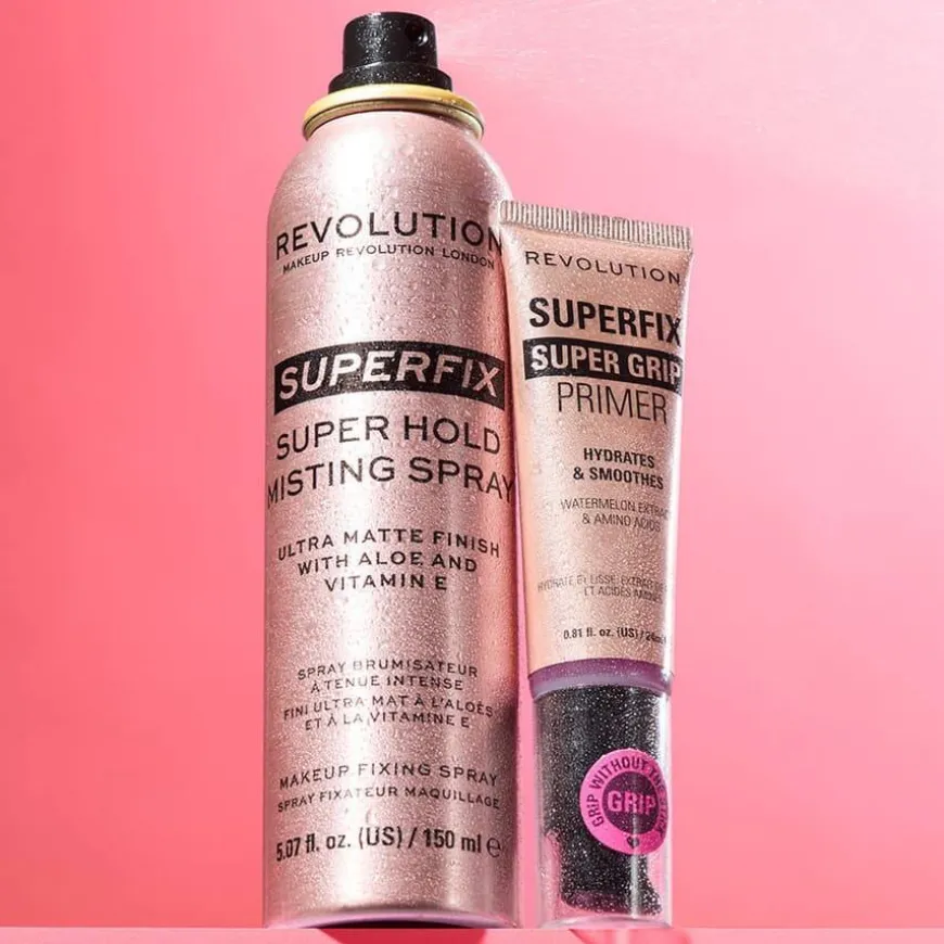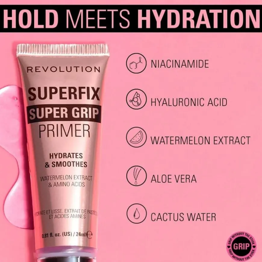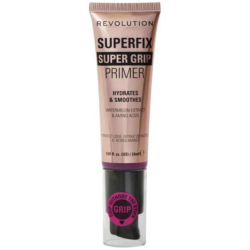 Revolution Superfix Grip Primer er en fuktighetsgivende og utjevnende gelprimer som sikrer at sminken holder hele dagen. Den er beriket med niacinamid for å minimere porer, hyaluronsyre for intens fuktighet og vannmelonekstrakt for en frisk glød. Formelen inneholder også aloe vera og kaktusvann for ekstra næring og beroligende effekt. Passer for alle hudtyper og gir en glatt, hydrert base som gjør at sminken sitter perfekt. Dermatologisk testet og ikke-komedogen.