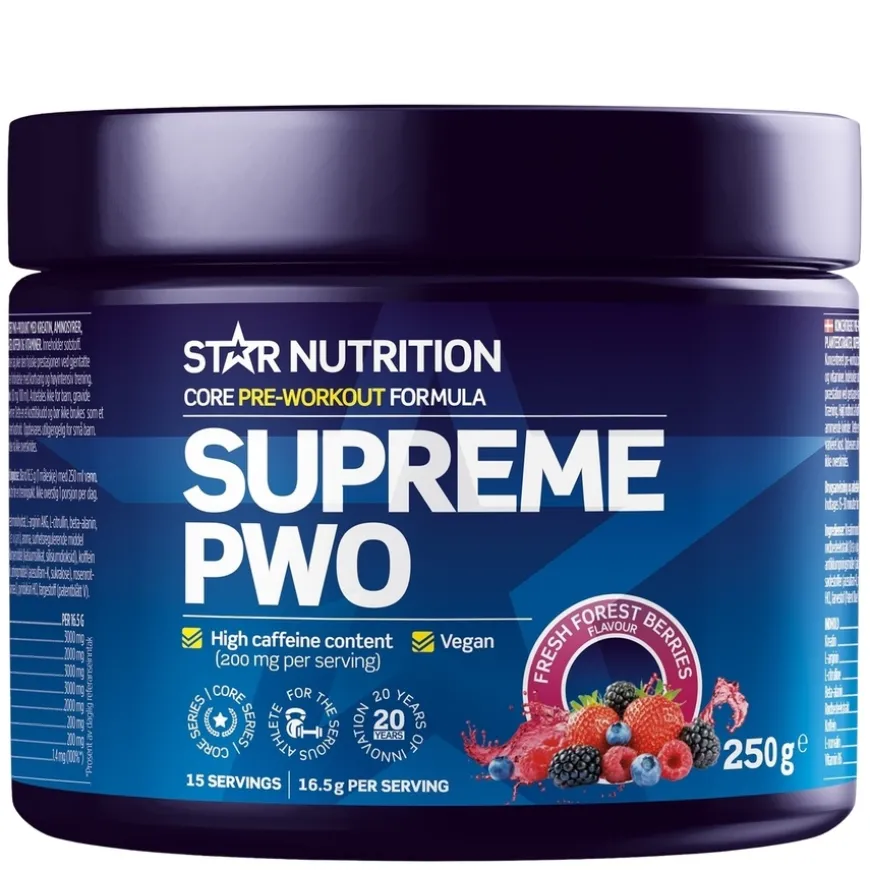 Supreme PWO 250g er et kraftig pre-workout-tilskudd fra Star Nutrition, utviklet for å maksimere ytelse, fokus og muskelpump. Produktet inneholder testede og velbalanserte ingredienser som kreatin og beta-alanin for økt styrke og redusert melkesyre, samt koffein og rosenrotekstrakt for skjerpet fokus og motivasjon. I tillegg bidrar L-citrullin, L-arginin og rødbetekstrakt til bedre blodtilførsel, næringsopptak og en intens pumpfølelse i musklene. Perfekt for deg som ønsker å prestere bedre på trening og oppnå raskere resultater. Supreme PWO er utviklet for både utholdenhet og styrketrening, og passer for seriøse utøvere på alle nivåer.
