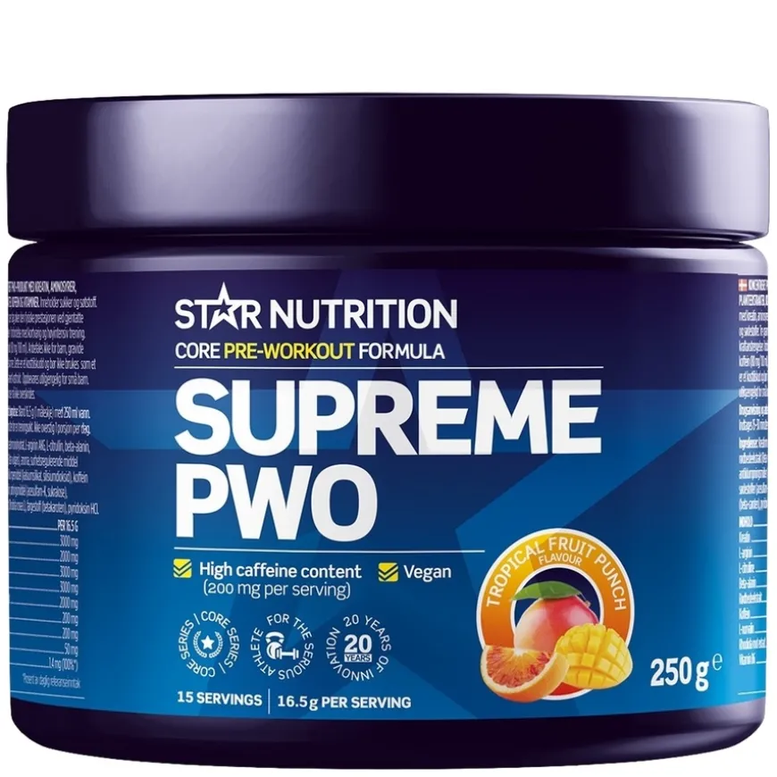 Supreme PWO 250g er et kraftig pre-workout-tilskudd fra Star Nutrition, utviklet for å maksimere ytelse, fokus og muskelpump. Produktet inneholder testede og velbalanserte ingredienser som kreatin og beta-alanin for økt styrke og redusert melkesyre, samt koffein og rosenrotekstrakt for skjerpet fokus og motivasjon. I tillegg bidrar L-citrullin, L-arginin og rødbetekstrakt til bedre blodtilførsel, næringsopptak og en intens pumpfølelse i musklene. Perfekt for deg som ønsker å prestere bedre på trening og oppnå raskere resultater. Supreme PWO er utviklet for både utholdenhet og styrketrening, og passer for seriøse utøvere på alle nivåer.