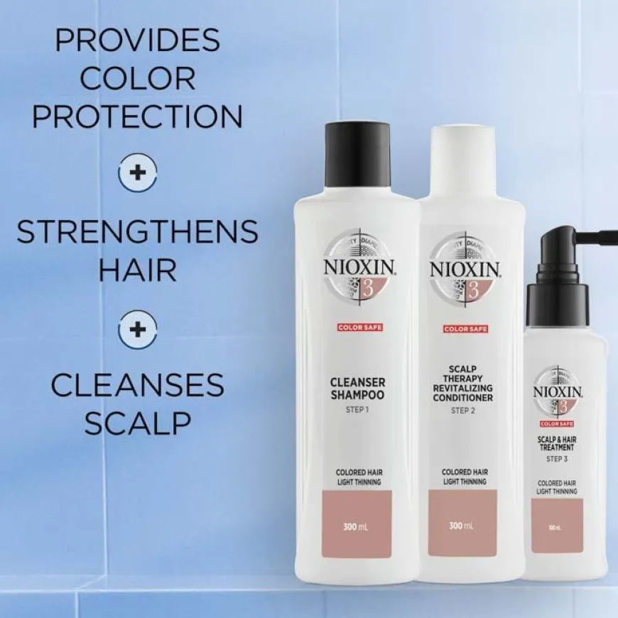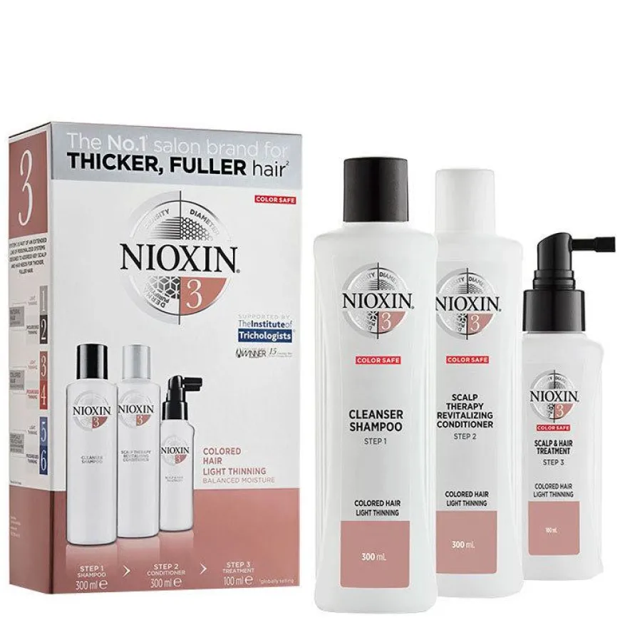 Nioxin System 3-rutinen frisker opp hodebunnen, reduserer hårtap på grunn av brukne hårstrå, styrker håret og gir fargebehandlet hår en sunn glans.
