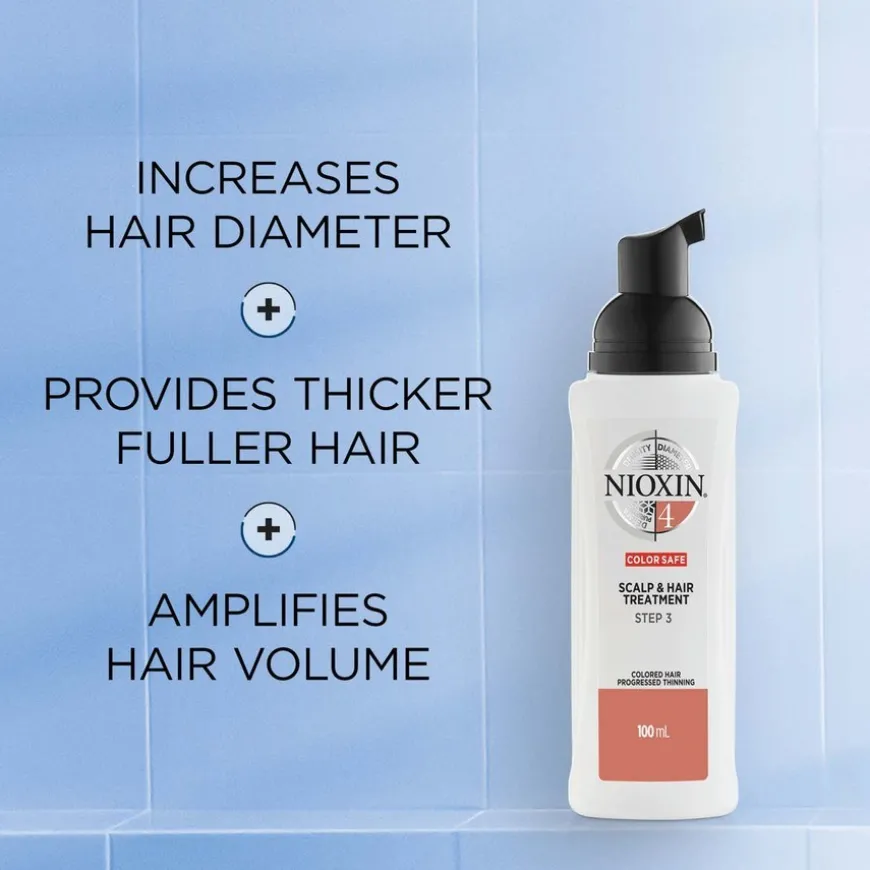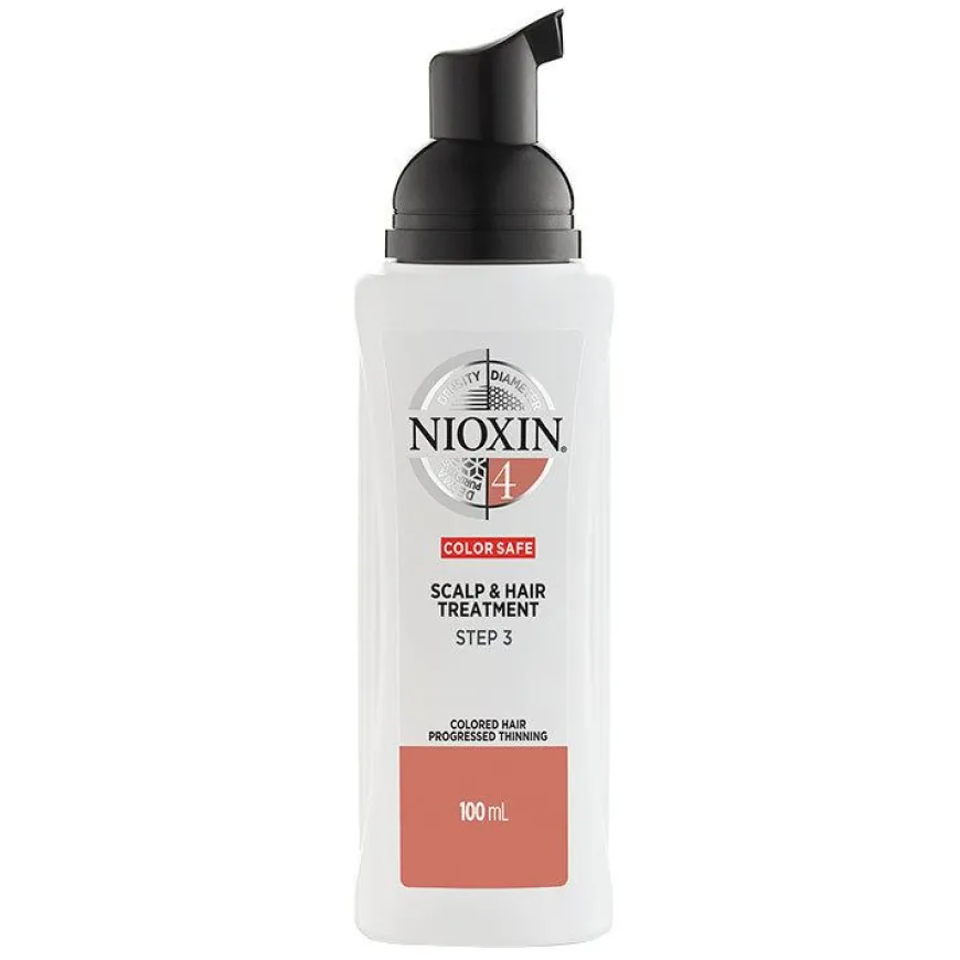 Nioxin System 4 Scalp & Hair Treatment for farget hår med avansert tynning er det siste trinnet i en tredelt Nioxin-rutine, som styrker hårets struktur og forebygger brukne hårstrå.