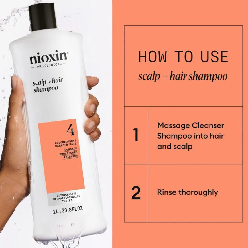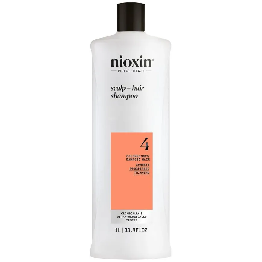 Nioxin System 4 Cleanser Shampoo for farget hår med progressiv tynning er det første trinnet i en tredelt Nioxin-rutine, spesielt utviklet for å styrke håret og hårstrukturen. Denne profesjonelle shampooen renser huden og fjerner smuss, overflødig olje og andre miljørester fra hodebunn og hår. Denne klinisk og dermatologisk testede shampooen inneholder niacinamid og biotin som fukter hodebunnen og håret fra rot til spiss, samtidig som den fortykker og styrker hårstrukturen. Avslutt med Nioxin System 4 Conditioner og Nioxin System 4 Treatment for best resultat.