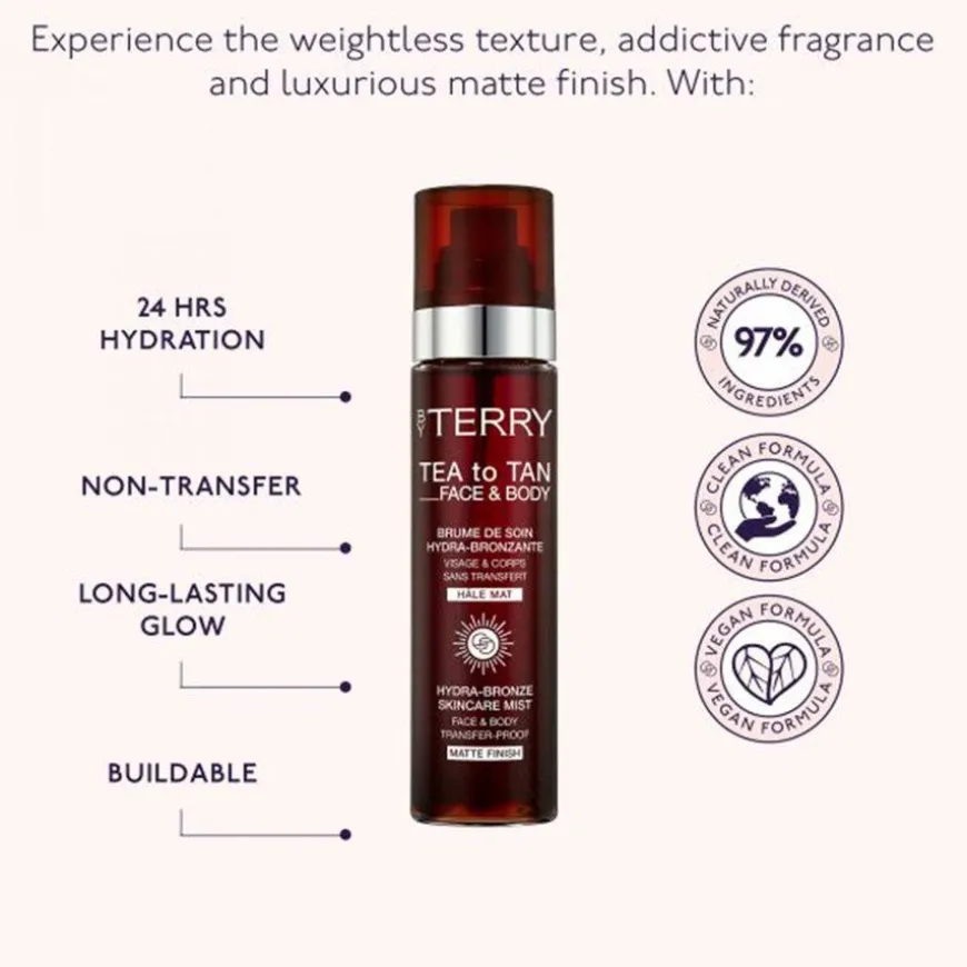 Tea to Tan Face & Body Matte Finish er en fuktighetsgivende og bronserende hudpleiemist med en naturlig matt finish. 10 år etter lanseringen av produktet, fornyer By Terry sin ikoniske Tea to Tan Face & Body Spray. Denne fuktighetsgivende hudpleiesprayen er nå fornyet med en helt ny formel og nytt design. Produktet har en unik blanding av hudpleie og bronzing-egenskaper som fukter og beskytter huden med en naturlig solkysset glød. Den vannbaserte formelen gir huden en langvarig farge uten å skape et dekkende lag.