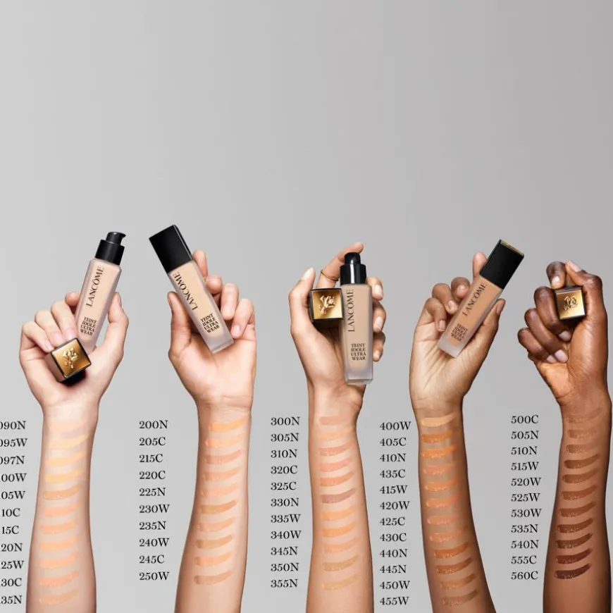 - Teint Idole Ultra Wear Foundation kommer i en rekke nyanser, utviklet med en innovativ fargebalanse ved bruk av oksidgrønne og ultramarine blå pigmenter.