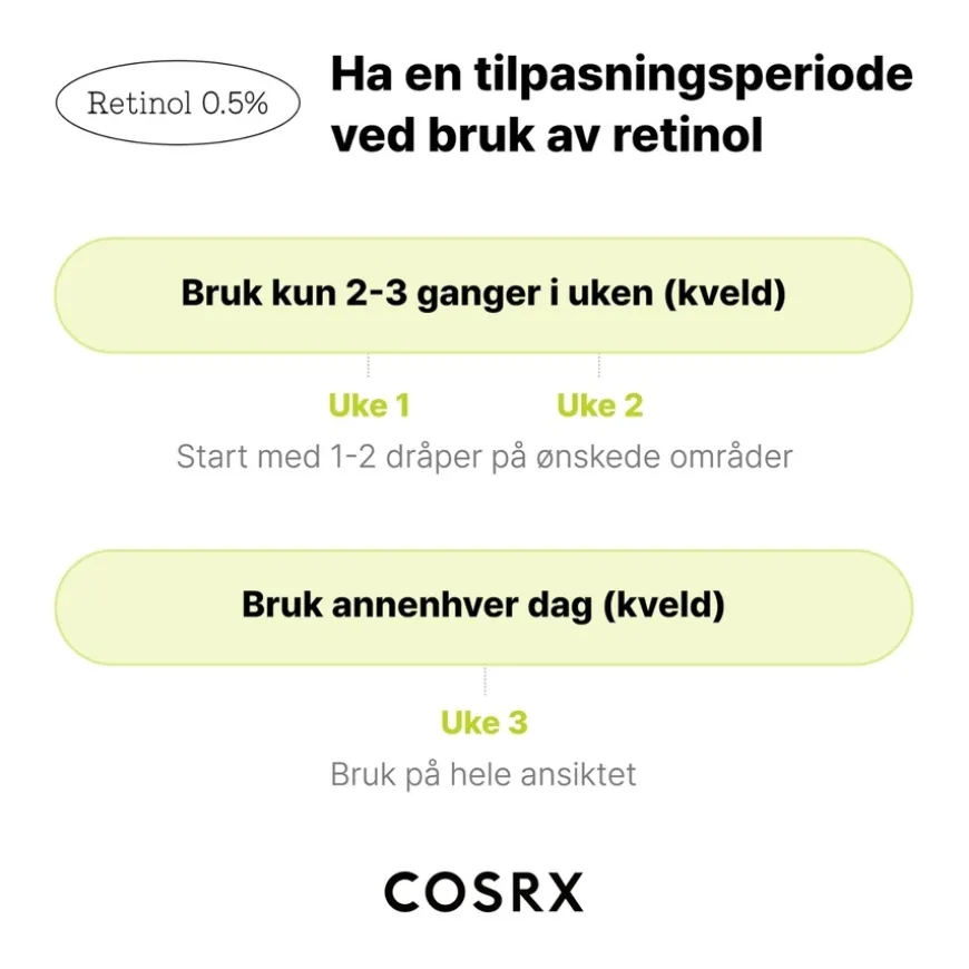 - Er du ny til retinol? Bruk max 2-3 kvelder i uken, og øk bruken gradvis til annenhver kveld.