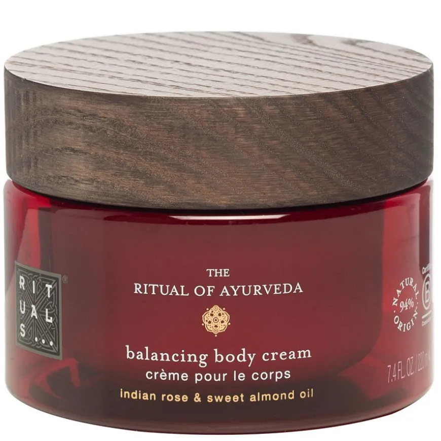 The Ritual Of Ayurveda Body Cream er en rik og nærende kroppskrem med en balanserende duft av indisk rose og mandelolje.