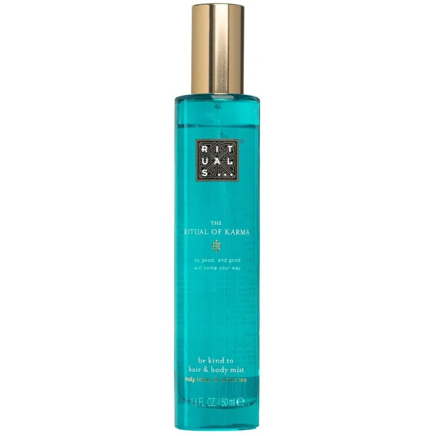 The Ritual Of Karma Hair & Body Mist er en hår- og kroppsspray med en herlig duft av lotus og hvit te. Sprayen er alkoholfri og etterlater ikke flekker.