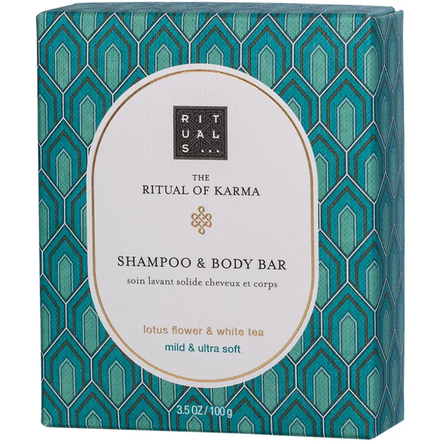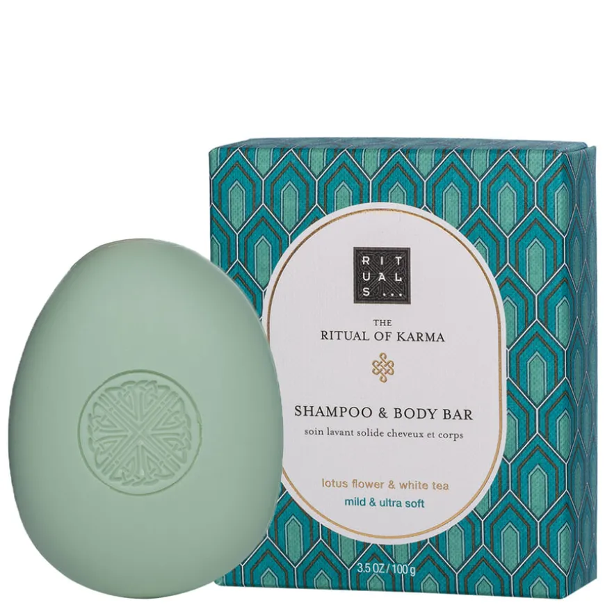The Ritual of Karma Shampoo & Body Bar er en alt-i-ett-løsning for både hår og kropp, perfekt for en effektiv og bærekraftig pleierutine. Denne luksuriøse, såpefrie baren er beriket med squalan og aloe vera for en skånsom rens som bevarer hudens og hårets naturlige fuktighet. Den oppløftende duften av hellig lotus og hvit te tilfører en frisk, sommerlig følelse, mens den plastfrie emballasjen gjør den til et mer miljøvennlig valg. Passer for alle hår- og hudtyper.
