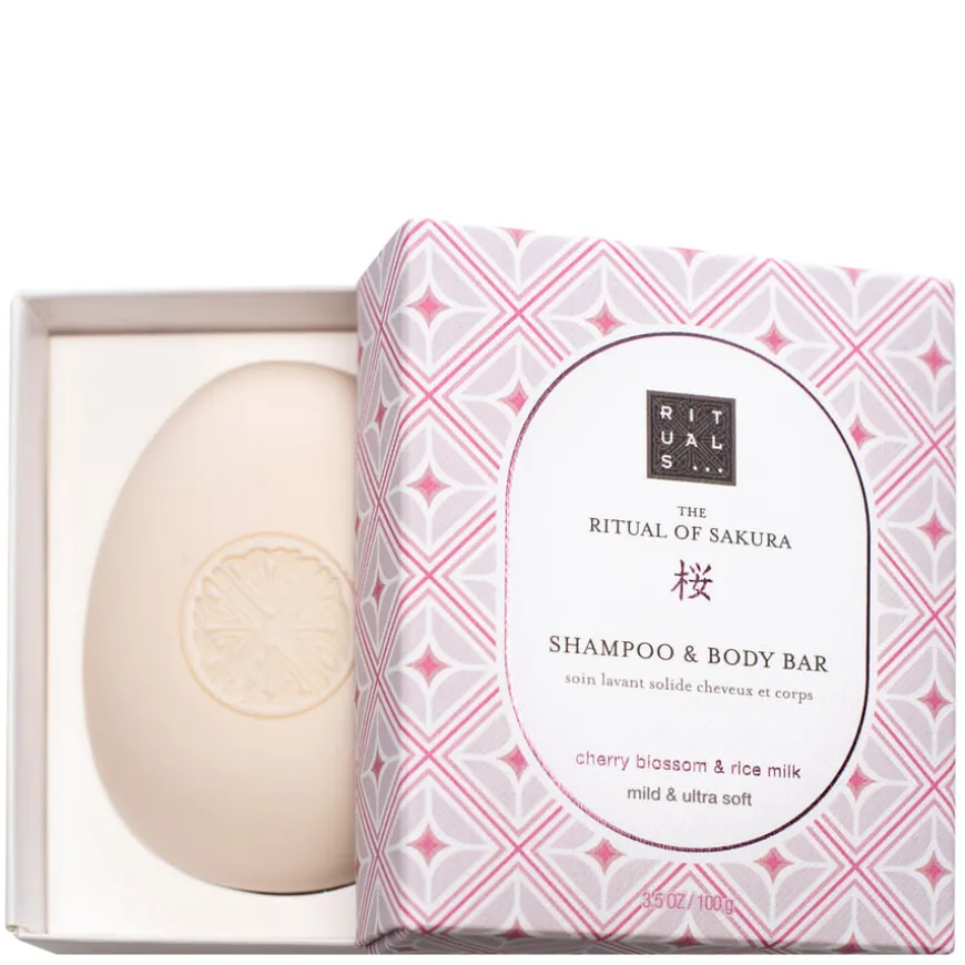 The Ritual of Sakura Beauty Bar er en luksuriøs, såpefri rensebar som skånsomt renser og tilfører næring til både hud og hår. Beriket med rismelk, som mykgjør huden og gir en sunn glød, og kirsebærblomst, kjent for sine pleiende og utjevnende egenskaper. Den blomstrende duften kombinerer friske, grønne noter med myke, melkeaktige undertoner. Passer for alle hår- og hudtyper og kommer i plastfri emballasje for en mer bærekraftig pleierutine.