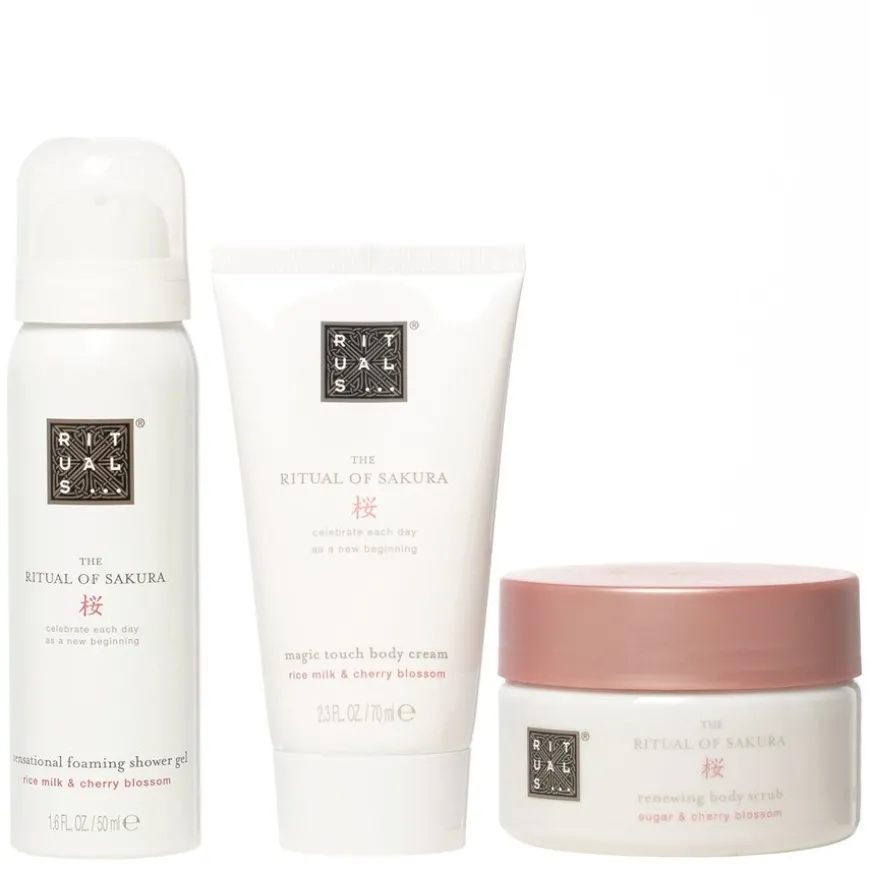 The Ritual Of Sakura Body Scrub 125g: Sucrose, Ethylhexyl Stearate, Isopropyl Myristate, Carthamus Tinctorius (Safflower) Seed Oil, Parfum/fragrance, Prunus Amygdalus Dulcis (Sweet Almond) Oil, Prunus Cerasus (Bitter Cherry) Shell Powder, Prunus Avium (Sweet Cherry) Flower Extract, Camellia Japonica Seed Oil, Oryza Sativa (Rice) Bran Oil, Simmondsia Chinensis (Jojoba) Seed Oil, Helianthus Annuus (Sunflower) Seed Oil, Tocopherol, Benzyl Salicylate, Cinnamyl Alcohol, Citronellol, Coumarin, Geraniol, Hexyl Cinnamal, Linalool, Alpha-isomethyl Ionone, Limonene.the Ritual Of Sakura Body Cream 70ml: Aqua/water, Cetearyl Alcohol, Glycerin, Caprylic/capric Triglyceride, Propylheptyl Caprylate, Undecane, Helianthus Annuus (Sunflower) Seed Oil, Parfum/fragrance, Prunus Avium (Sweet Cherry) Fruit Extract, Oryza Sativa (Rice) Extract, Centella Asiatica Leaf Extract, Allantoin, Ubiquinone, Tocopherol, Tocopheryl Acetate, Propylene Glycol, Caprylyl Glycol, Carbomer, Sodium Polyacrylate, Ceteareth-20, Glyceryl Stearate, Ceteareth-12, Cetyl Palmitate, Tridecane, Isohexadecane, Butylene Glycol, Sodium Citrate, Benzyl Salicylate, Cinnamyl Alcohol, Citronellol, Coumarin, Geraniol, Hexyl Cinnamal, Isoeugenol, Linalool, Alpha-isomethyl Ionone, Limonene, Phenoxyethanol, Potassium Sorbate, Sodium Metabisulfite, Sorbic Acid, Citric Acid, Sodium Hydroxide.the Ritual Of Sakura Foaming Shower Gel 50ml: Aqua/water, Sodium Coco-sulfate, Decyl Glucoside, Isopentane, Coco-glucoside, Glycerin, Parfum/fragrance, Peg-120 Methyl Glucose Dioleate, Isobutane, Isopropyl Palmitate, Oryza Sativa (Rice) Extract, Prunus Serrulata (Cherry) Flower Extract, Citric Acid, Sodium Benzoate, Hexyl Cinnamal, Guar Hydroxypropyltrimonium Chloride, Benzyl Salycilate, Linalool, Coumarin, Citronellol, Geraniol, Alpha-isomethyl Ionone, Cinnamyl Alcohol, Tocopherol, Potassium Sorbate, Sodium Citrate, Sorbic Acid.