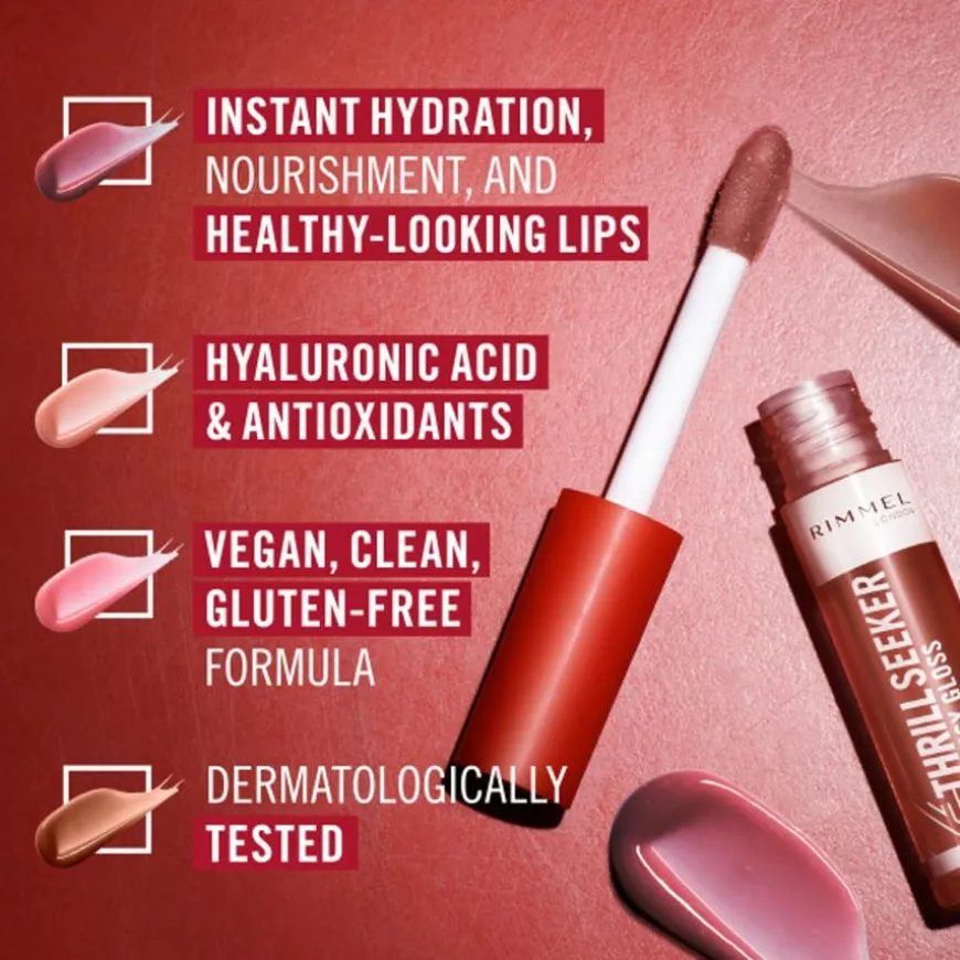 Rimmels dristige doe-foot applikator gir en behagelig påføring ved å fange akkurat riktig mengde av den fuktighetsgivende lipglossen.