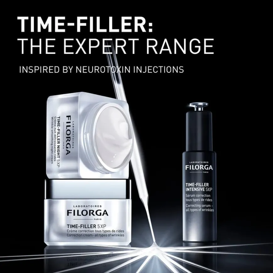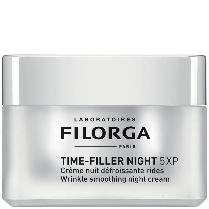 Time-Filler Night 5XP er en utjevnende nattkrem som synlig reduserer forekomsten av fem forskjellige typer rynker: pannerynker, bekymringsrynker, kråkeføtter/latterlinjer, nasolabiale linjer og soverynker. Formelen med tripeptid, hyaluronsyre og utjevnende planteekstrakt virker om natten for å hydrere, mykgjøre og forbedre hudens elastisitet og tekstur, samtidig som den reduserer forekomsten av fine linjer og rynker. I tillegg forsterkes huden med antioksidanter. Time-Filler Night 5XP har en lett tekstur og passer for alle hudtyper.