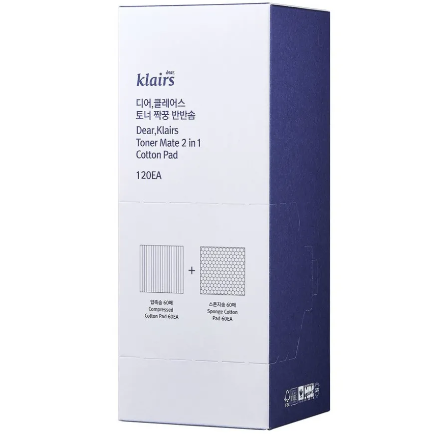 To typer førsteklasses bomullpads – totalt 120 stk. Hvis du ønsker å forbedre effekten av hudpleierutinen din, prøv disse. Det er to typer i en boks, den ene typen er komprimert og den andre har en svampete overflate. Begge er laget av 100 % ren bomull som verken loer eller revner.
