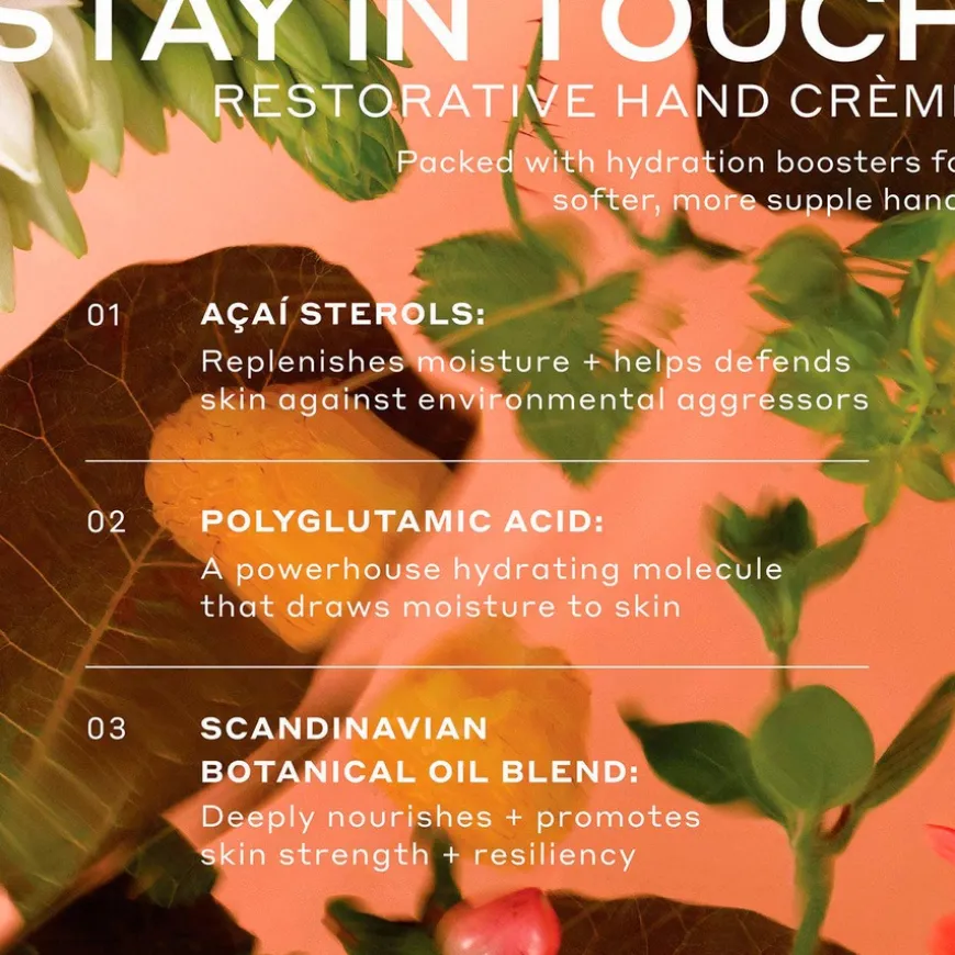 Touch Hand Creme er klinisk testet for å gjenopprette tørr hud. Resultatet er en mykere hud og mer smidige hender. Denne håndkremen har en hurtigabsorberende formel, som består av en frodig blanding av skandinaviske botaniske oljer, antioksidantrike acai-steroler og polyglutaminsyre som øyeblikkelig vil gjenopprette en fuktig, jevn hudtekstur og dermed også redusere fine linjer og rynker. Håndkremen fungerer også fantastisk på neglebånd og har en beroligende effekt på stresset hud. Ole Henriksen vet at du vil elske håndkremens myke og rike tekstur med frisk duft av grape-frukt.