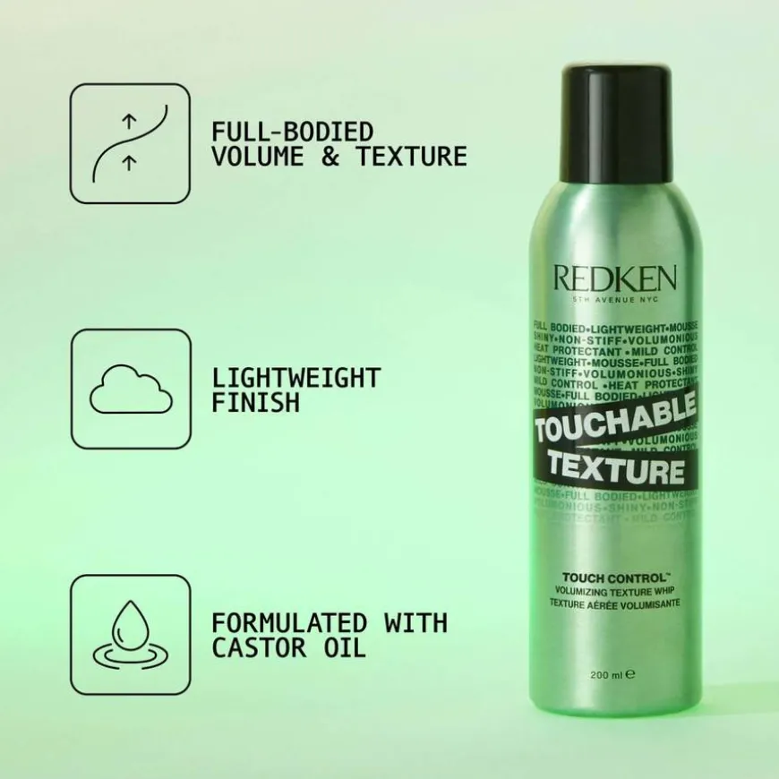 Touchable Texture Mousse er en varmebeskyttende mousse som etterlater håret med varig glans, volum og tekstur. Touchable Texture fra Redken skaper utrolig volum, form og bevegelse! Denne lette, volumgivende moussen forbedrer glansen og etterlater en naturlig følelse uten å virke stiv, for et hår som er fullt av struktur, volum og tekstur. Arbeid produktet inn i fuktig hår før luft- eller varmetørking for ekstra myk tekstur. Denne moussen er formulert med glyserin og hjelper til med å mykne og gi volum til håret.