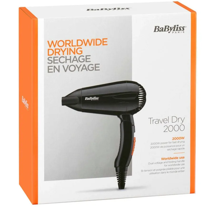 Travel Dry 2000 er en kompakt hårføner med effekt på 2000 W og dobbel spenning for rask tørkning hjemme eller når du er på farten. Tørk håret raskt uansett hvor du er. Lett å holde, og har sammenleggbart håndtak, slik at den enkelt får plass i vesken – det perfekte reisefølget.