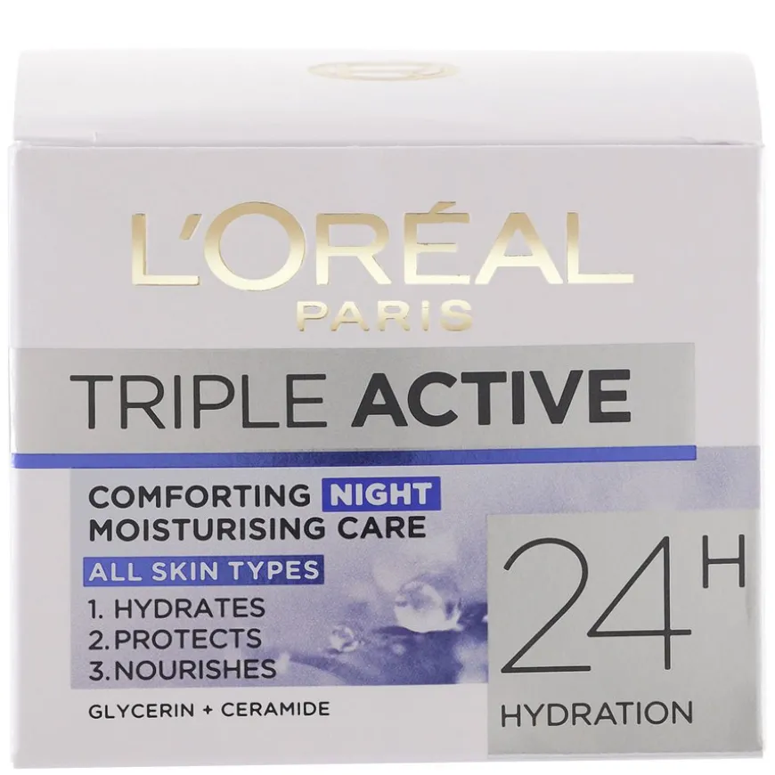 Triple Active Comforting 24H Night Cream er en fuktighetsgivende nattkrem som hjelper huden med å restituere seg om natten. Hver dag utsettes huden for ytre påvirkning, som UV-stråler, stress og forurensning. Disse faktorene kan gjøre huden tørr og forårsake for tidlig aldring av huden. Triple Active Comforting Night Moisturising Care tilfører fuktighet, beskytter og gir huden næring i løpet av natten. Formelen med fuktighetsgivende glyserin tilfører huden optimal fukt. Nattkremen er også beriket med ceramid og beskytter huden mot å bli tørr. Huden føles frisk og uthvilt om morgenen. Huden restituerer seg og får næring i løpet av natten. Huden er umiddelbart fuktet, får næring og føles myk og behagelig. Om morgenen oppleves huden frisk og uthvilt og full av glød.