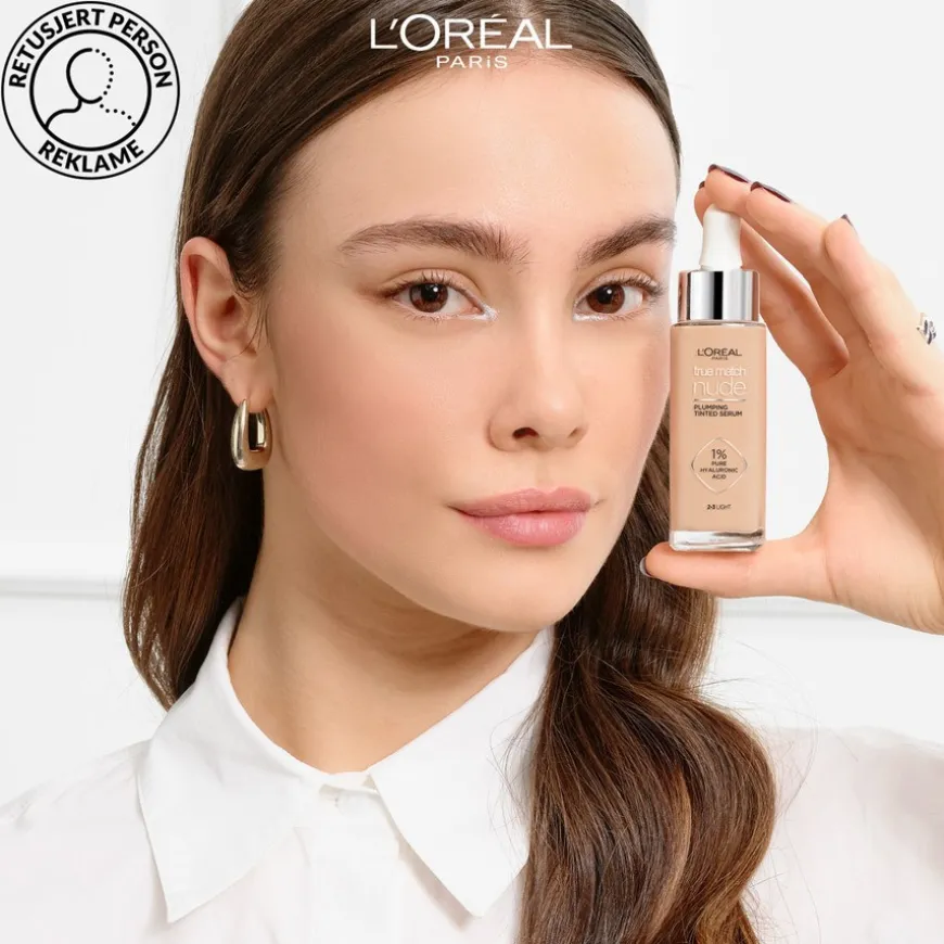 L’Oréal Paris True Match Nude Plumping Tinted Serum er et parfymefritt foundation serum med lett dekkevne for en nude look som dekker ujevnheter uten å tette porene. En formel med mineralpigment, glyserin, 1 % hyaluronsyre gir huden langvarig fuktighet og gjør den fyldig og naturlig strålende. På 1 time er huden 24 %* mer fuktet og synlig fyldigere. Vegansk formel**. Passer alle hudtyper, også sensitiv. Testet under dermatologisk kontroll.