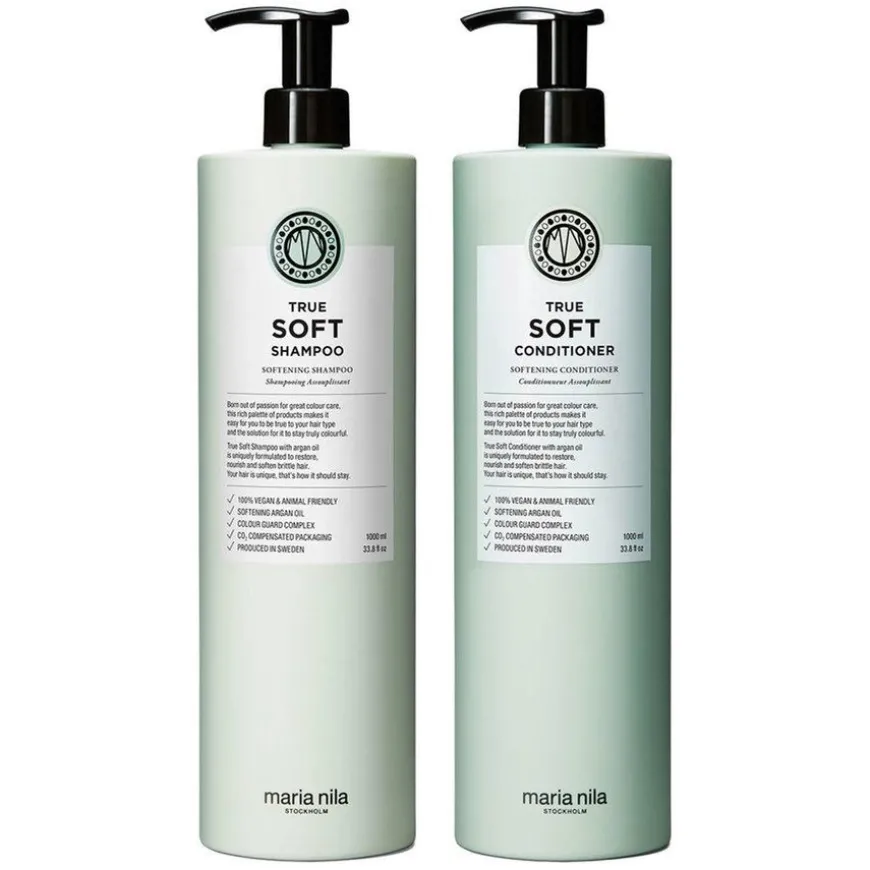 - Maria Nila True Soft Shampoo 1000ml:True Soft Shampoo er en shampoo som fukter og gjenoppliver tørt og krusete hår. Med ingredienser som arganolje og antioksidanter vil disse produktene bevare fuktighet, bekjempe statisk elektrisitet og gi glans.