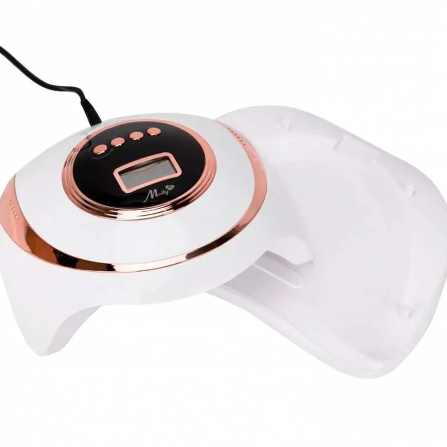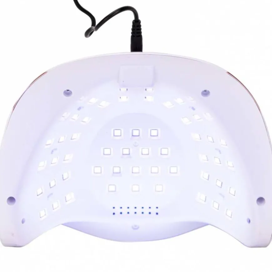 På den annen side er 57 energisparende lysdioder plassert i lampens kuppel på en slik måte at du kan være sikker på at produktet alltid er perfekt herdet , også på tommelen. Lampen har en bevegelsessensor og en innebygd timer med praktisk LCD-skjerm, som har fire driftsmoduser: 10 sek., 30 sek., 60 sek., 99 sek. Den siste – den lengste modusen er funksjonen som oftest brukes med produkter som forårsaker ubehag under herding (f.eks. baking dekkegeler). Når den 99 andre tiden startes, øker kraften gradvis, noe som reduserer de ubehagelige følelsene knyttet til polymeriseringen av produktet til et minimum.
