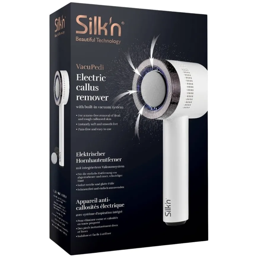 VacuPedi Callus Remover er en elektrisk callusfjerner med vakuumsystem. Gled deg over velstelte, myke føtter på sekunder med Silk’n VacuPedi. Denne smarte elektriske fjerneren for hard hud fungerer med roterende slipeskiver og et innebygd vakuumsystem. Den enkle og problemfrie måten å fjerne hard hud på. Og enda viktigere, det blir ikke noe rot!