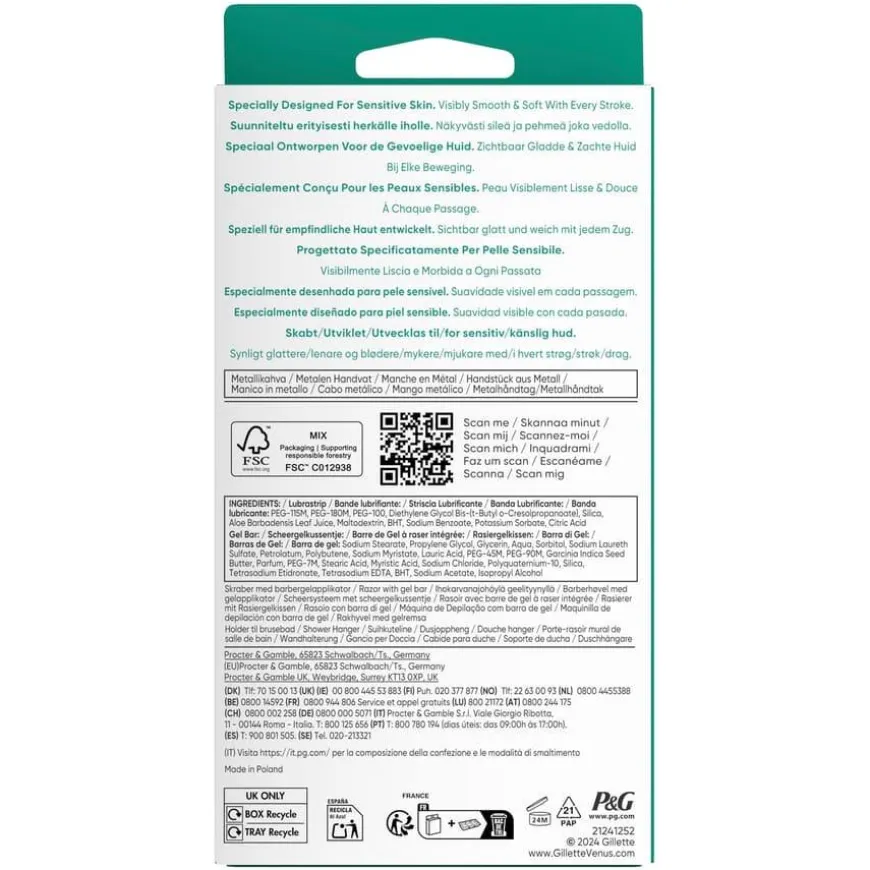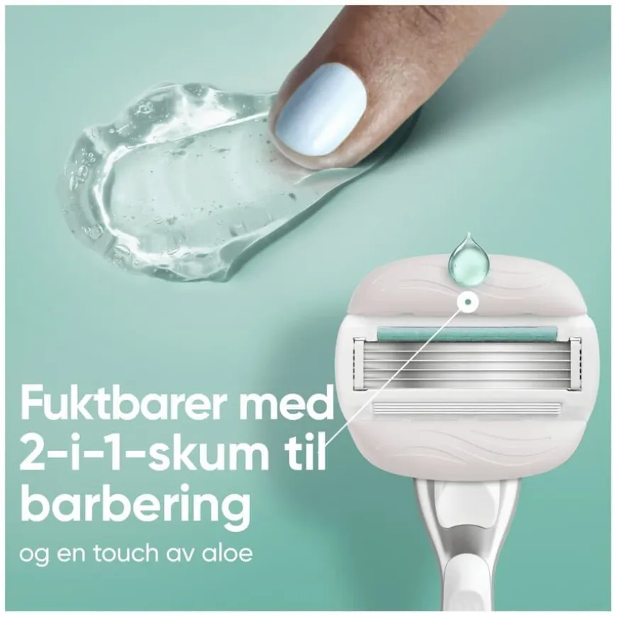 Venus Pro ComfortGlide Sensitive Razor er en høykvalitets barberhøvel for kvinner, spesielt utviklet for tørr og sensitiv hud. Med 5 blader og en SkinCushion-smørestripe med en touch av aloe, gir høvelen en tett og skånsom barbering samtidig som den beskytter huden mot irritasjon. Det solide, vektede metallhåndtaket gir bedre presisjon og kontroll, og passer med alle Venus-bladrefiller (unntatt Simply Venus og Venus Pubic Hair & Skin). Barberbladet skummer og barberer i ett strøk, for en rask og effektiv rutine. Medfølgende dusjholder holder høvelen ren og hygienisk mellom bruk. Dermatologisk godkjent og anbefalt for sensitiv hud.