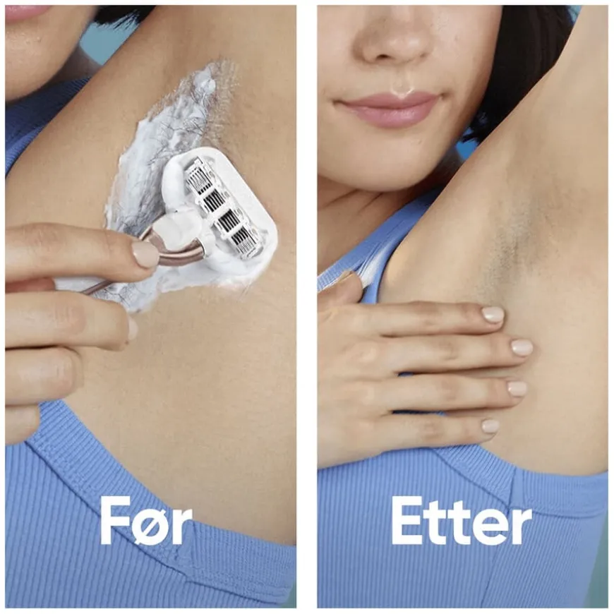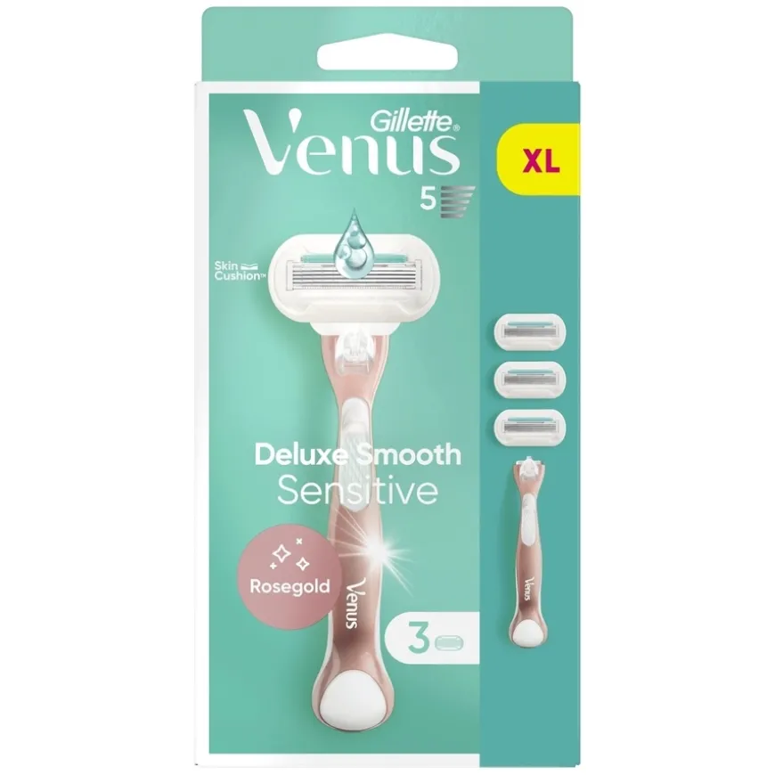 Venus Pro Smooth Sensitive Razor er en høykvalitets barberhøvel utviklet spesielt for kvinner med sensitiv hud. Den har 5 ultraskarpe blader for en ekstra tett barbering som gir opptil 30 dager med glatt hud. SkinCushion-smørestripen og SkinElixir-gelen med en touch av aloe bidrar til å beskytte huden mot barberingsirritasjon – med opptil 0 % irritasjon. Det solide, vektede metallhåndtaket gir presis kontroll under barbering og kan brukes med alle Venus-bladrefiller (unntatt Simply Venus og Venus Pubic Hair & Skin). Høvelen leveres med en praktisk dusjholder som holder den ren og tørr mellom bruk. Perfekt for deg som ønsker effektiv og skånsom hårfjerning tilpasset sensitiv hud.