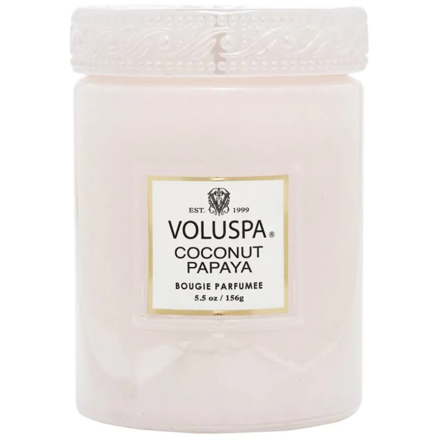 Vermeil Collection Small Jar Candle Coconut Papaya fra Voluspa er et tropisk og eksklusivt duftlys. Lyset har en herlig kombinasjon av den kremete duften av fersk kokos og den søte, fruktige aromaen av moden papaya. Laget med kokosvoks for en ren og langvarig brenning, kommer det i en stilfull glasskrukke som både er funksjonell og dekorativ. Perfekt for å skape en varm og avslappende atmosfære i ethvert rom.