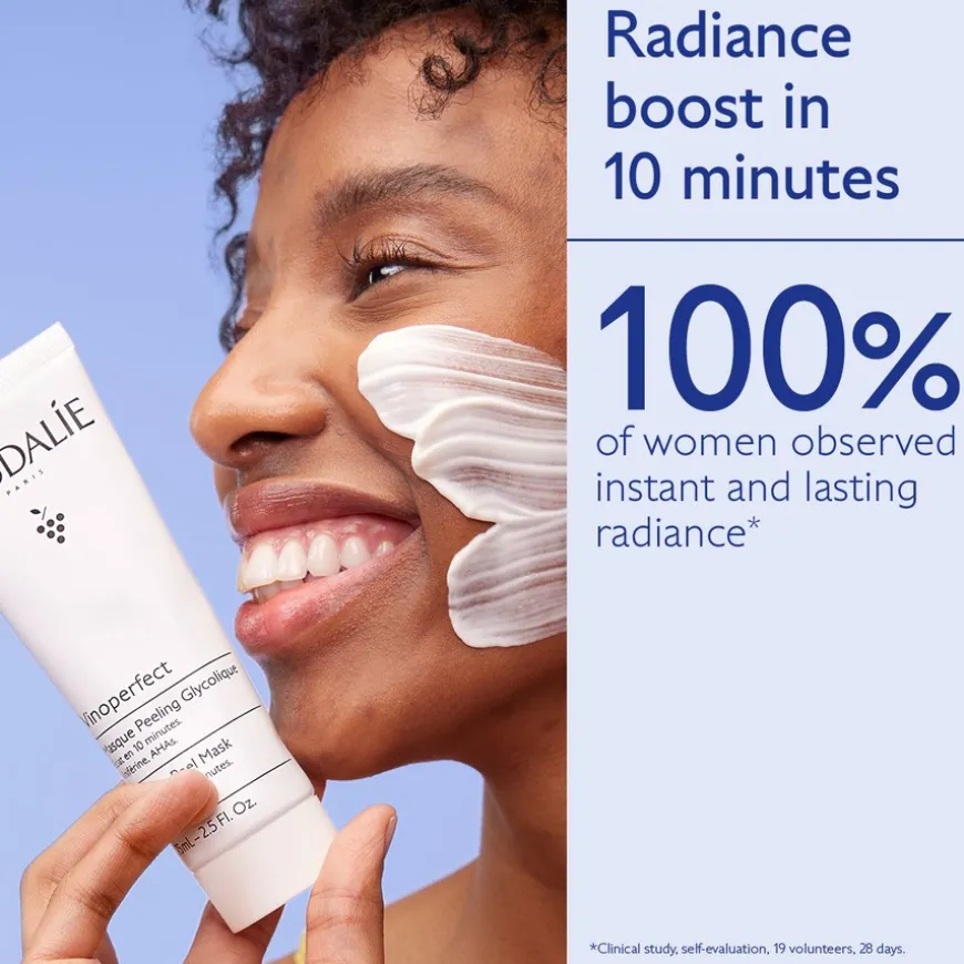 Caudalie Vinoperfect Glycolic Peel Mask gir en umiddelbar boost av glød til livløs hud. Behandlingen virker som en eksfolierende skrubb som stimulerer til cellefornyelse. Ansiktsmaskens formel inneholder 85.7% naturlige ingredienser, deriblant lysnende Viniferine og glødgivende papaya. Passer for alle hudtyper.