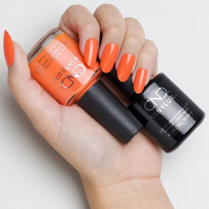 VINYLUX Long Wear Polish er en neglelakk med ukelang holdbarhet og pleiende ingredienser som ikke trenger underlakk, fra det verdensledende salongmerket CND VINYLUX. En herlig varm oransjefarge med en heldekkende, kremet finish. Et populært valg for solbrun hud.