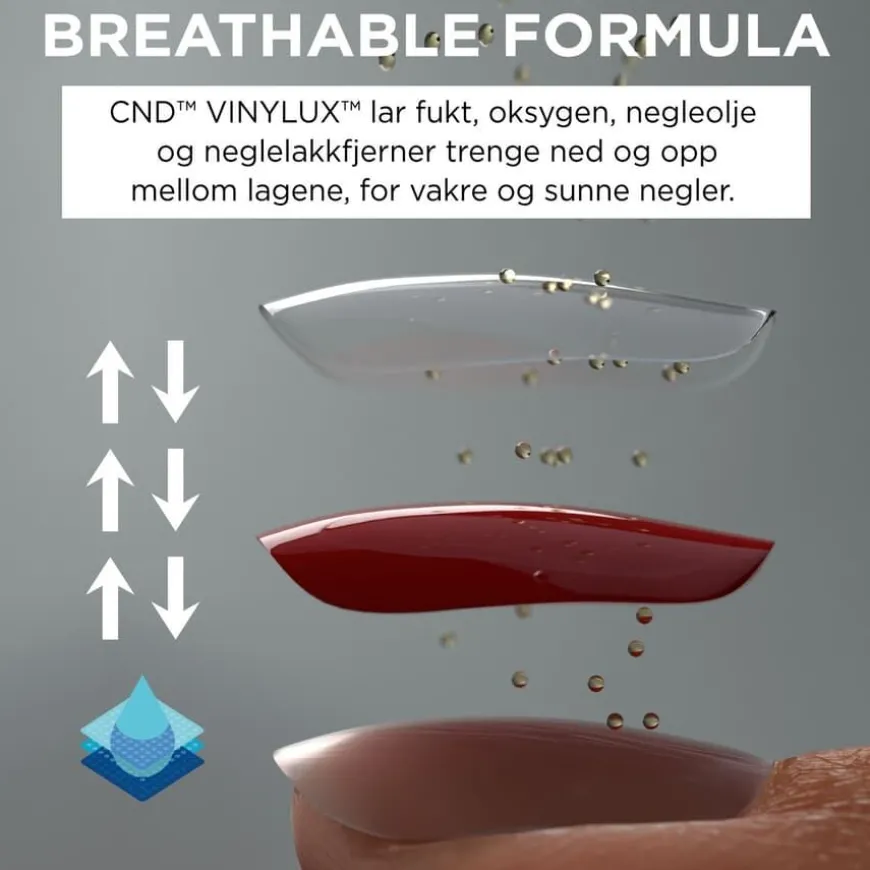 Den innovative selvheftende teknologien gjør at lakken ikke krever underlakk, noe som gir en raskere påføring og en hurtigtørkende finish. Sammen med CND Vinylux Long Wear Top Coat gir den en feilfri manikyr med fantastisk glans som varer hele uken. Den pustende formelen lar fuktighet og oksygen passere gjennom lagene, noe som bidrar til sunne, sterke negler. Perfekt for deg som ønsker salongkvalitet hjemme.