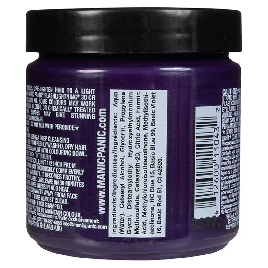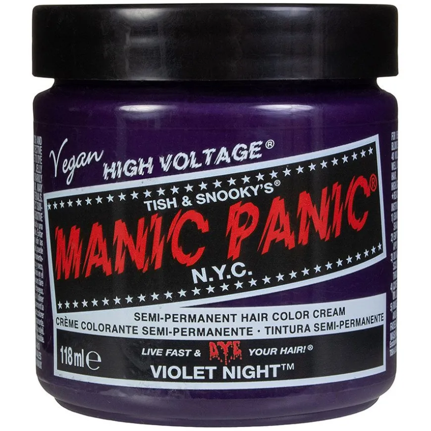 Violet Night er Manic Panics mørkeste lilla farge. Denne nyansen kan også gi helt ubleket hår den mørke lilla fargen, men for best resultat anbefales det å lysne håret til nivå 7 blond eller lysere før påføring av Manic Panics Violet Night.