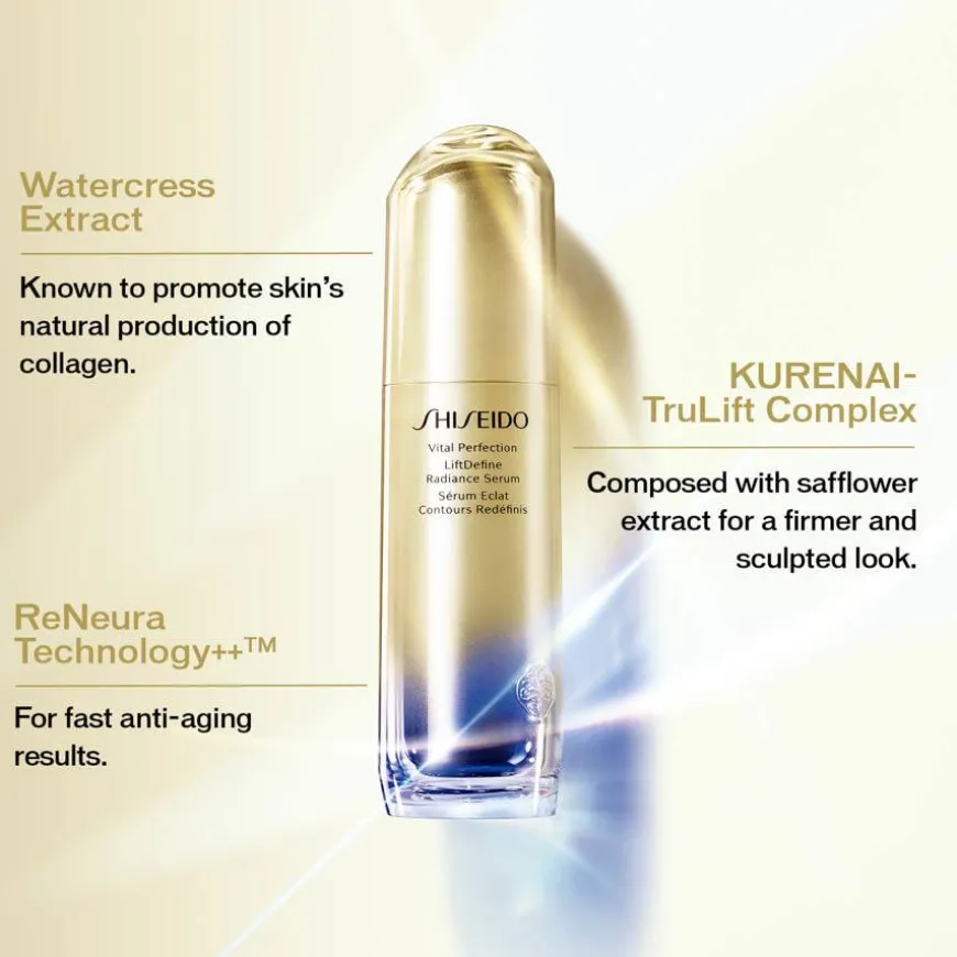 Opplev en mer oppstrammet og løftet look medVital Perfection Liftdefine Radiance Serum. Huden i ansiktet og på halsen får en naturlig og fin glød. Inneholder Shiseidos Pure Retinol som er svært effektivt mot linjer og rynker, kombinert med vitamin C som gir en klarere hudtone og glød. Med den unike ReNeura Technology++™ vil serumet se akkurat hva din hud trenger, slik at du får en mer spesialisert hudpleie tilpasset akkurat dine behov.