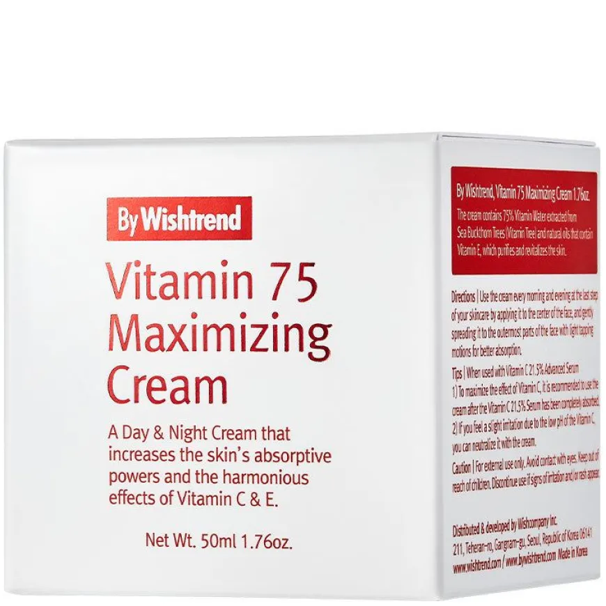 Vitamin 75 Maximizing Cream er en antioksidantrik, beskyttende 24-timers krem. Perfekt for fet hud!Fet hud trenger også fukt, men gjerne vannbasert fukt som denne kremen. Vitamin 75 Maximizing Cream er en krem full av antioksidanter og E-vitamin som reparerer huden. For at de aktive ingrediensene skal absorbere bedre og huden gi huden nok fukt består denne kremen av 75% Hippophae Rhamnoides (havtornsvann). Havtornsekstrakt, makadamianøttolje og solsikkefrø gjør at huden absoberer vitaminer bedre for maksimal effekt. Resultatet blir forbedret elastisitet, spenst og glød.